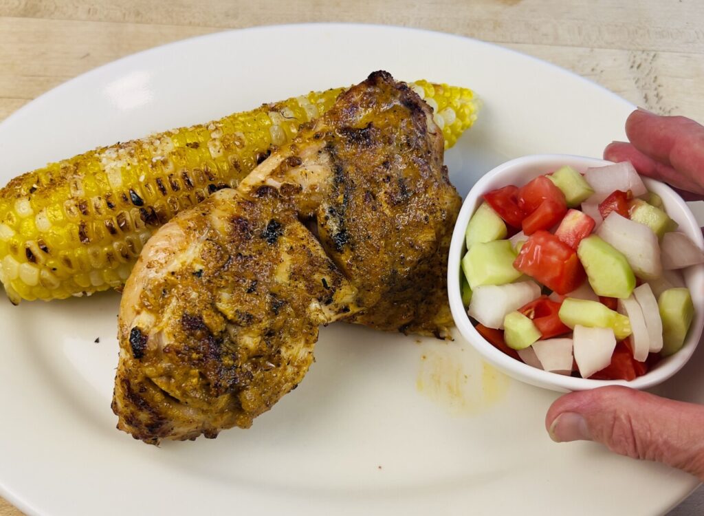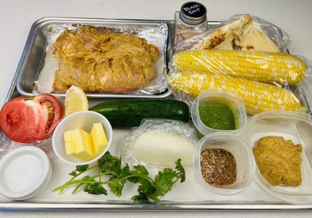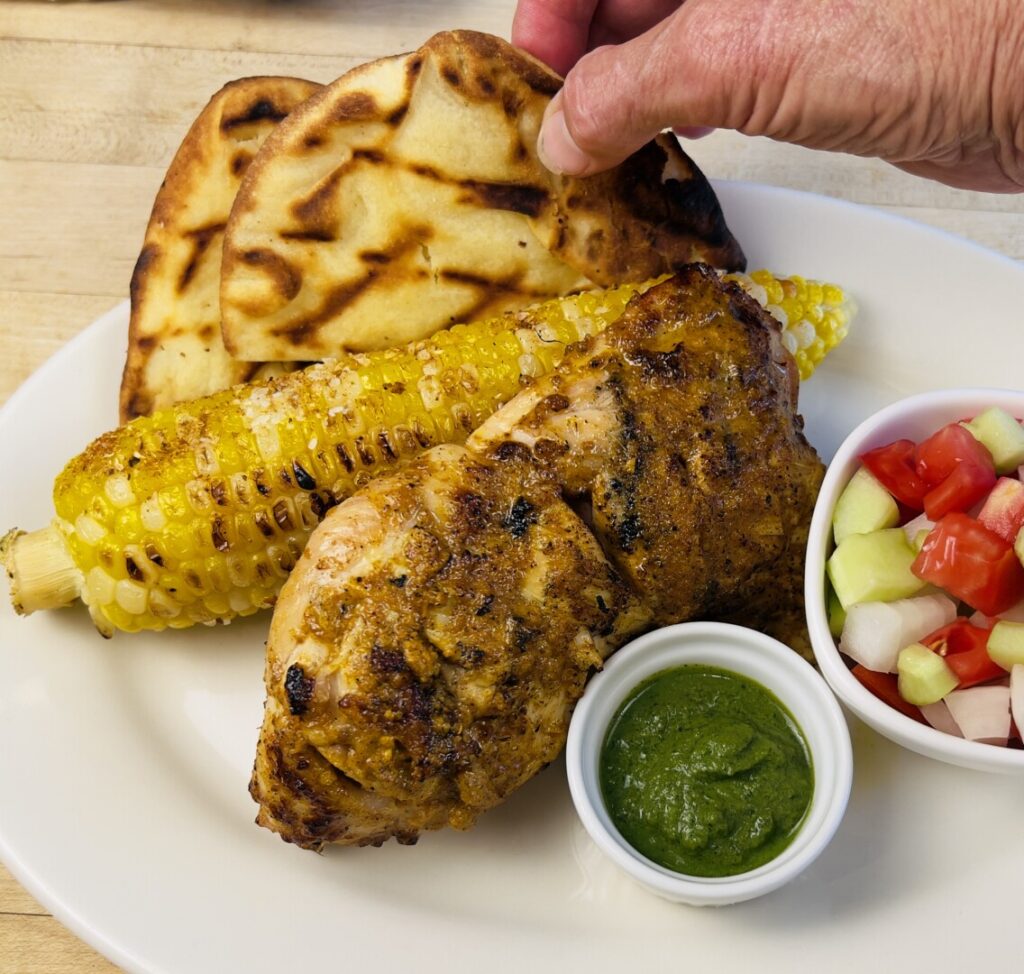 Tandoori-Grilled Chicken with Indian Street Corn, Naan, and Kachumber Salad