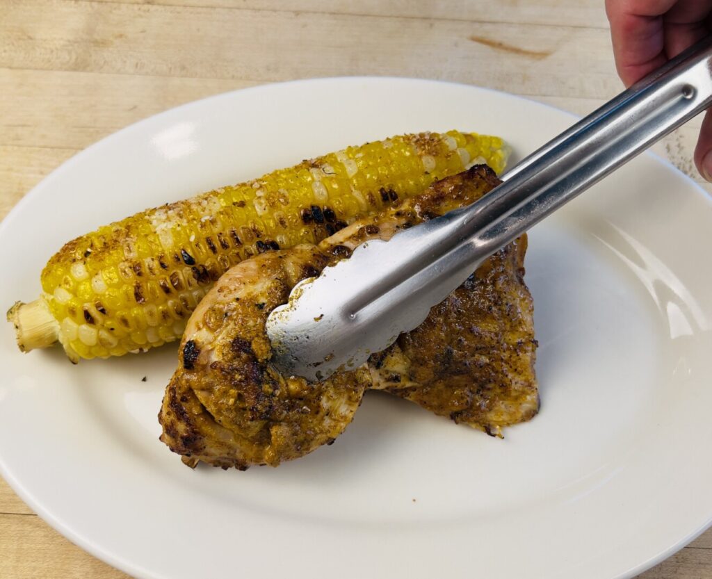 - On a tray, assemble the corn ears, the chicken, the chicken marinade, and the melted butter.