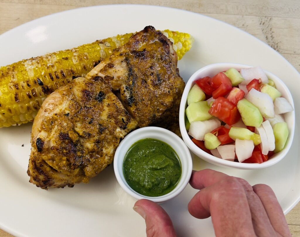 HOLD: Refrigerate all ingredients except the corn masala up to 4 days. If holding the chicken longer than 24 hours, scrape off the marinade and refrigerate both separately up to 4 days. If holding the chutney longer than 1 day, freeze it. Hold the corn masala at cool room temperature up to 1 week.