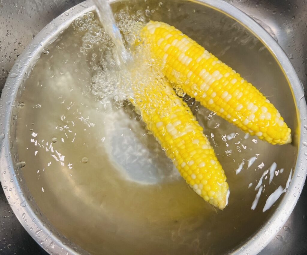 - Lift the corn out into the bowl and then place the bowl in the sink under cold running water for about 3 minutes.