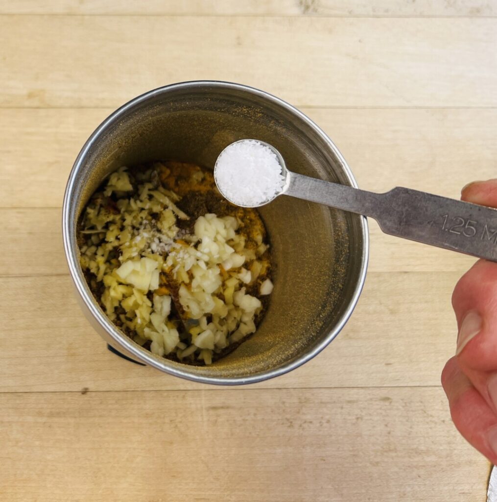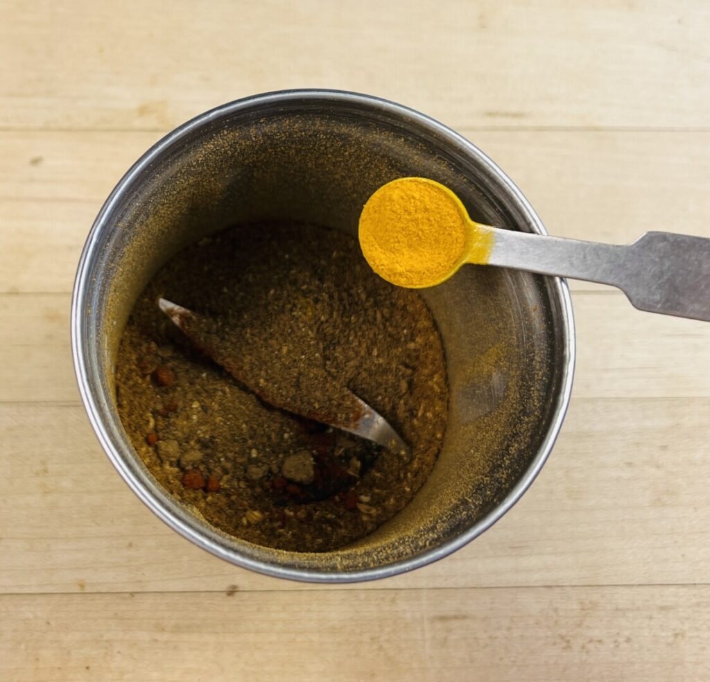 - Add to the grinder the garam masala, the step 2 Kashmiri chile powder or hot paprika, turmeric, the step 2 minced ginger and garlic, and salt.
