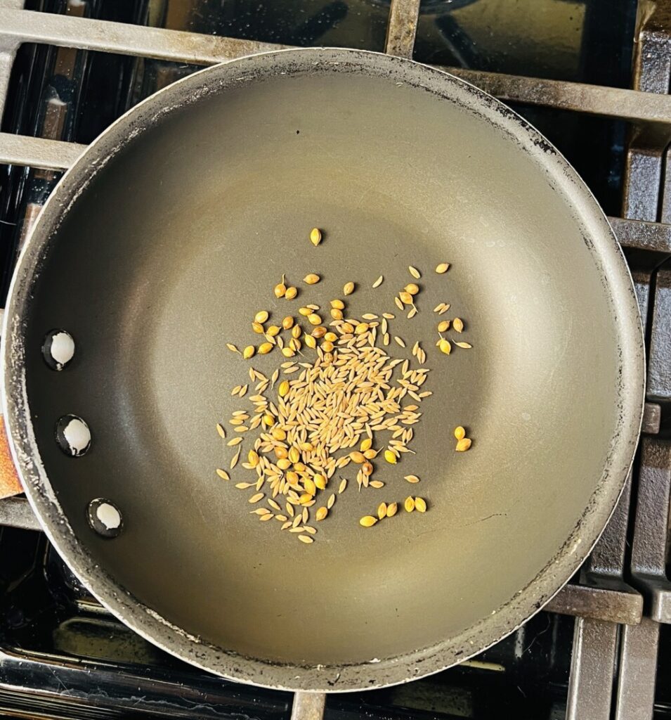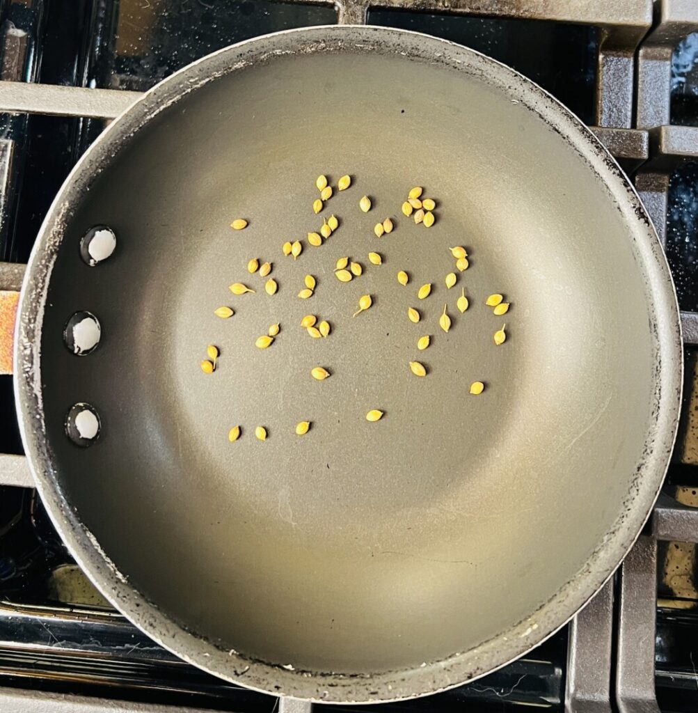 - Place a small sauté pan over medium heat and add the step 1 coriander seeds. Toast the seeds, shaking the pan often, for about 1 minute. Add the step 1 cumin seeds to the pan and continue shaking until the seeds become fragrant and darken slightly. Don’t allow the seeds to turn brown or scorch.