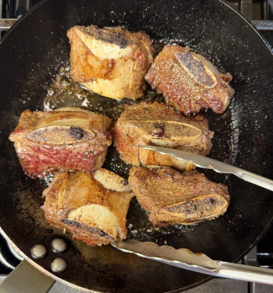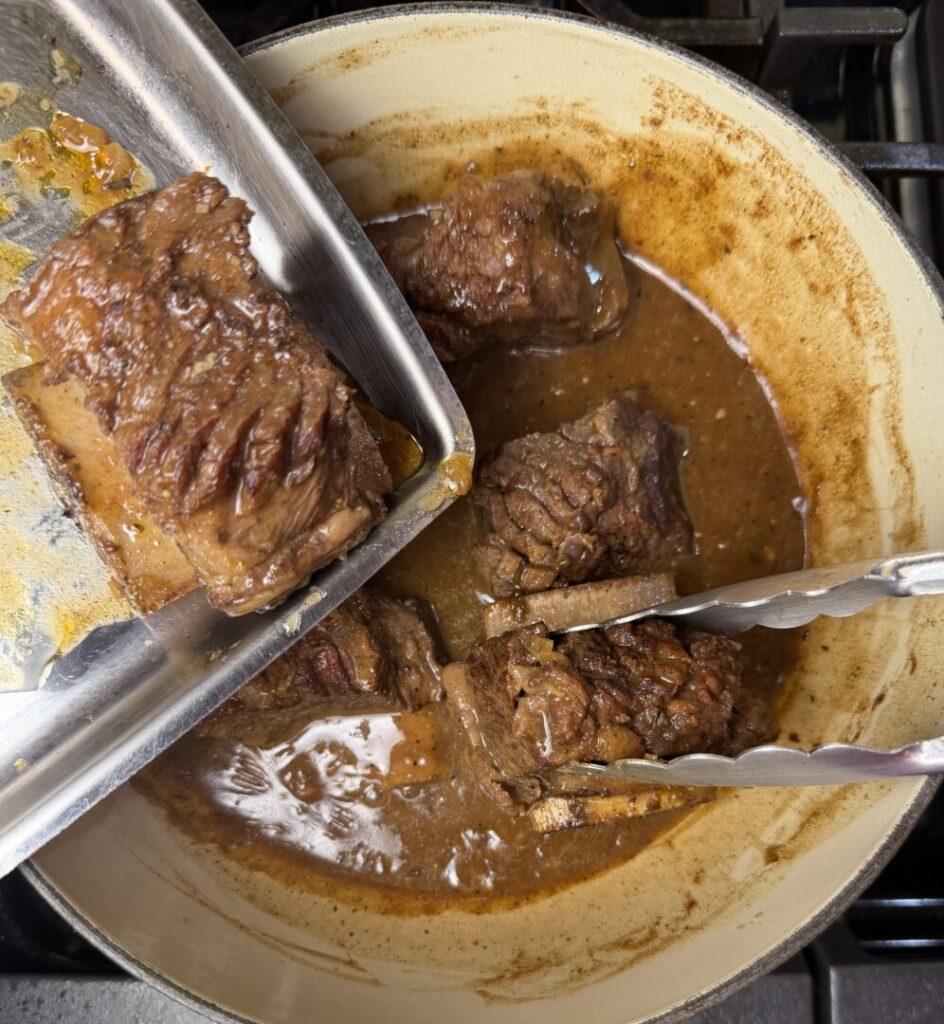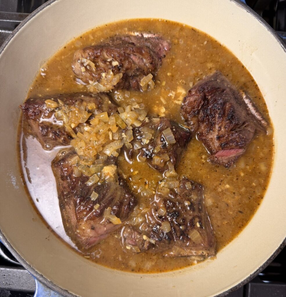 The first step in braising is browning. Choose a heavy sauté pan, such as the DeBuyer Mineral B pan I use. Make sure the pan is large enough to accommodate the short rib pieces without crowding the pan. Heat the pan over medium heat until hot, add some oil, and then place the rib pieces in the pan, bone-side up. Sauté to a rich, golden brown, then turn over. The bone sides won’t brown as evenly or as dark, but at least sauté until the bones lose their raw appearance. Then turn the ribs onto their various sides to brown the entire exterior of each rib. Transfer the browned ribs to a heavy casserole, such as a Le Creuset Dutch oven.