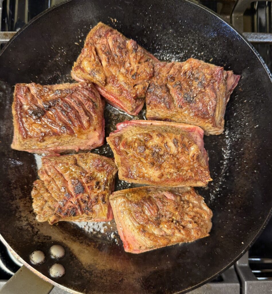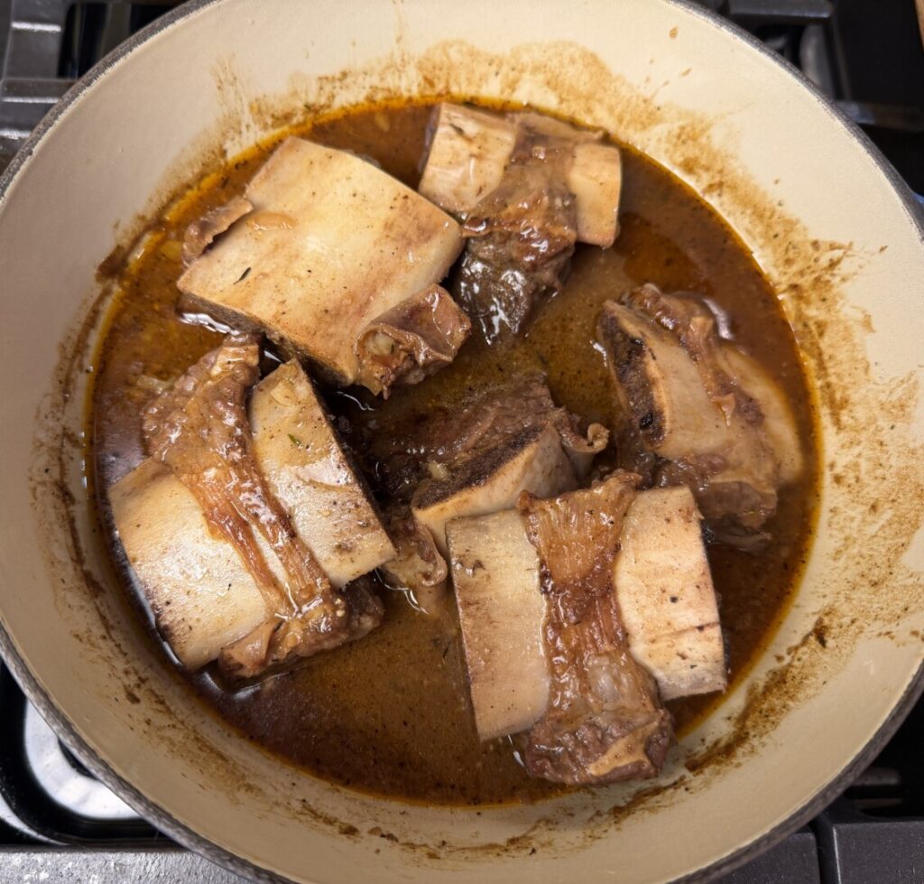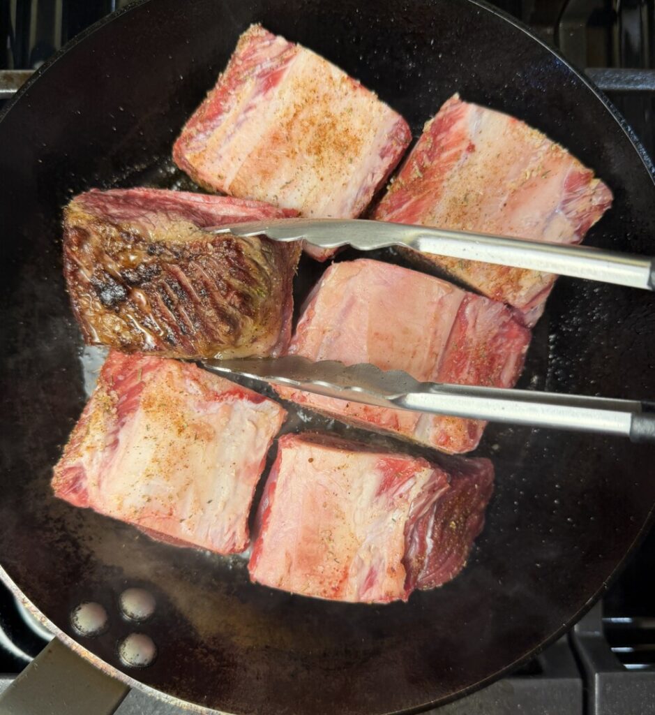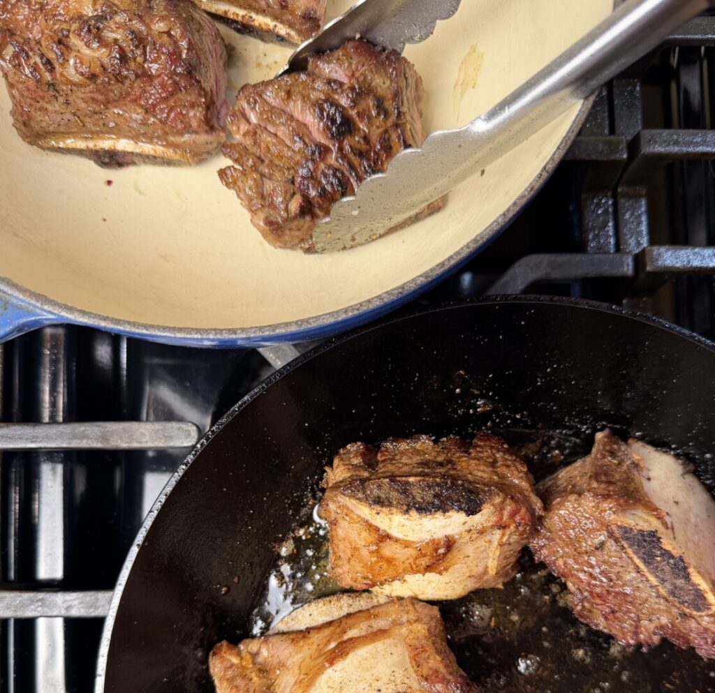 The first step in braising is browning. Choose a heavy sauté pan, such as the DeBuyer Mineral B pan I use. Make sure the pan is large enough to accommodate the short rib pieces without crowding the pan. Heat the pan over medium heat until hot, add some oil, and then place the rib pieces in the pan, bone-side up. Sauté to a rich, golden brown, then turn over. The bone sides won’t brown as evenly or as dark, but at least sauté until the bones lose their raw appearance. Then turn the ribs onto their various sides to brown the entire exterior of each rib. Transfer the browned ribs to a heavy casserole, such as a Le Creuset Dutch oven.