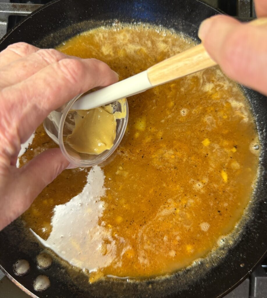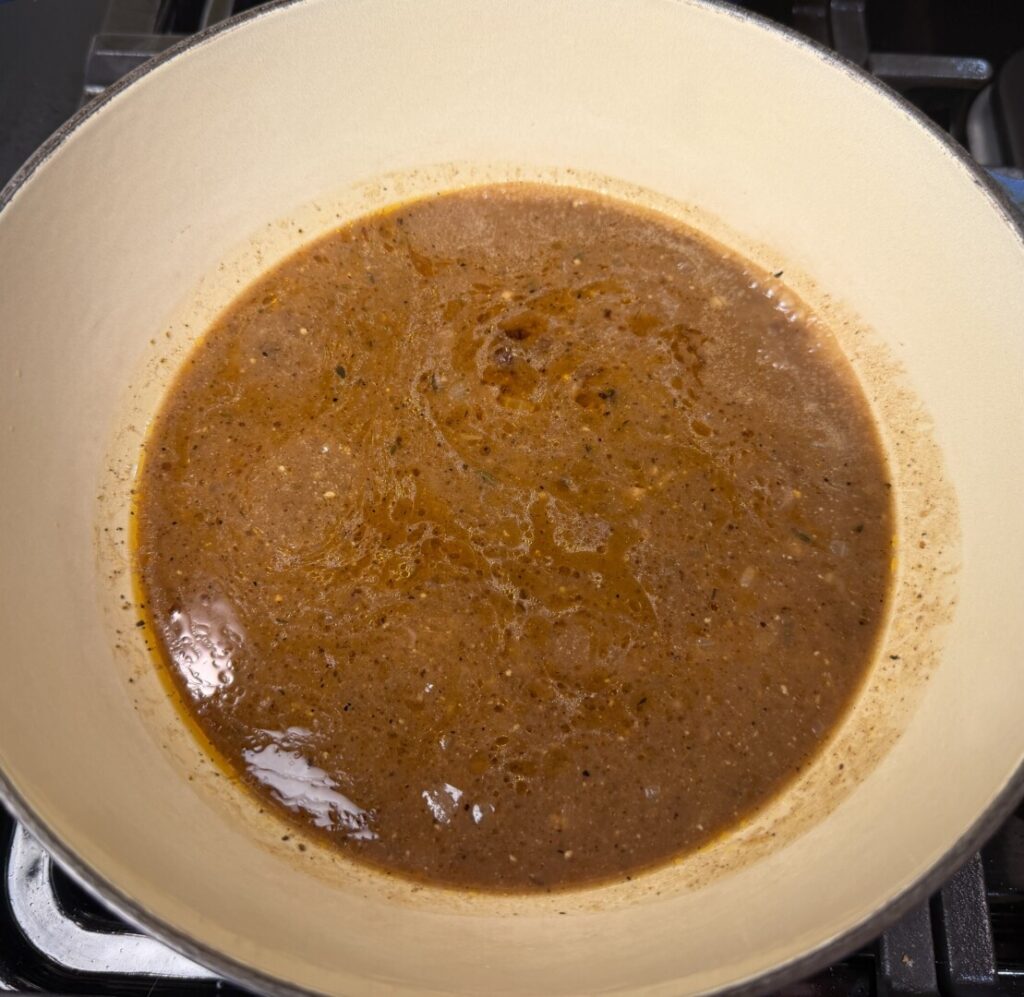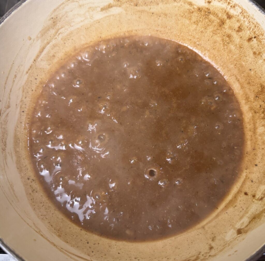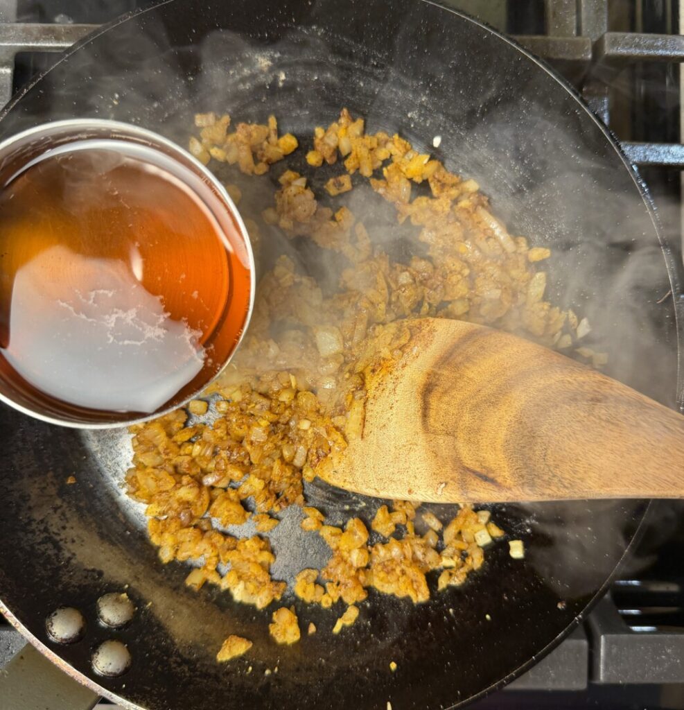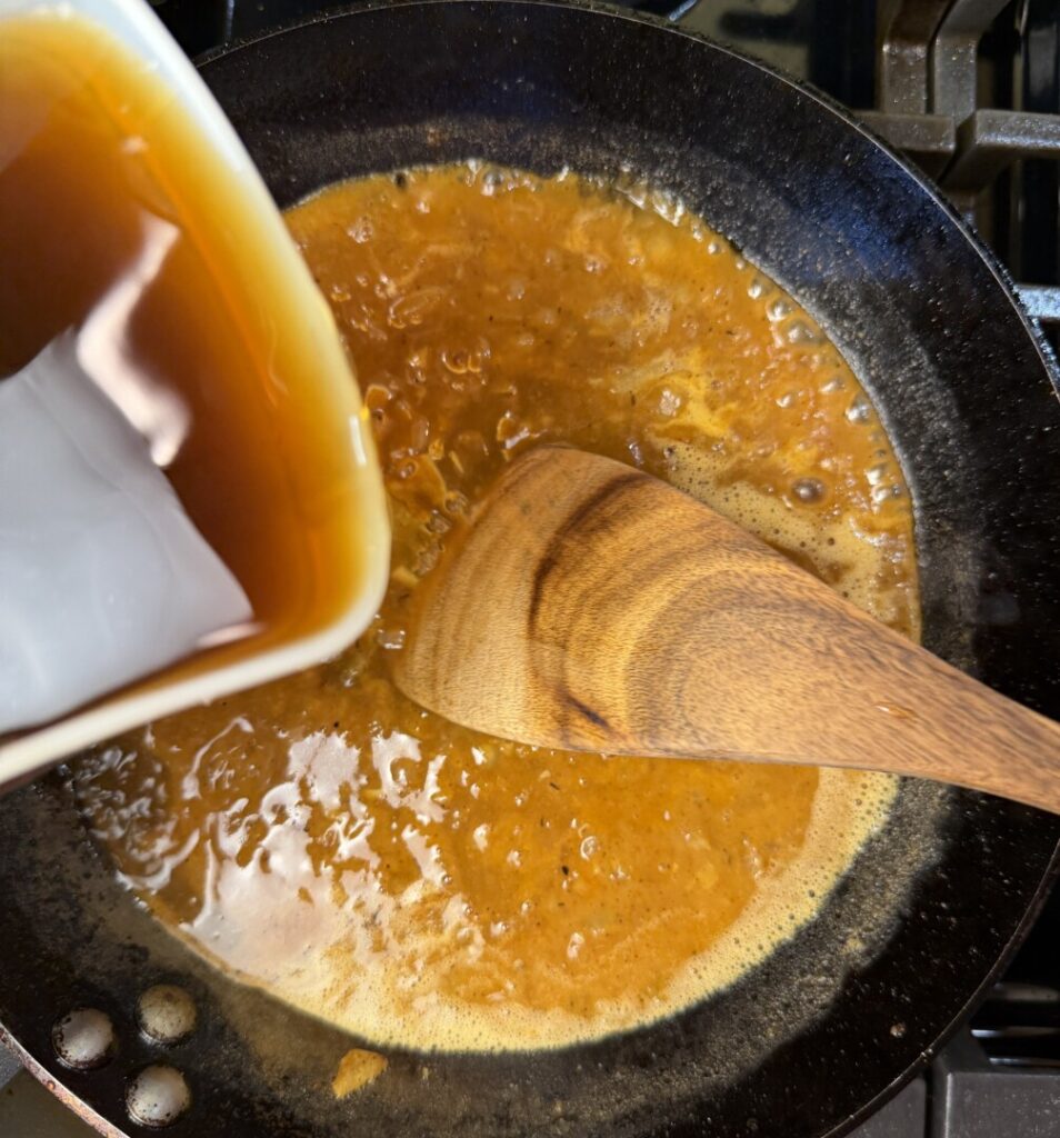 Next, start the sauce. Check the surface of the pan to make sure that the sucs (flavorful browned bits of protein) are not scorched or blackened. If they are, you’ll need to wash out the pan lest the sauce acquire a bitter flavor. There should be about 3 Tbsp fat left in the pan. Sauté the onions golden brown, then add the garlic, flour, and chili powder. Cook, stirring constantly, to make a light brown roux.
