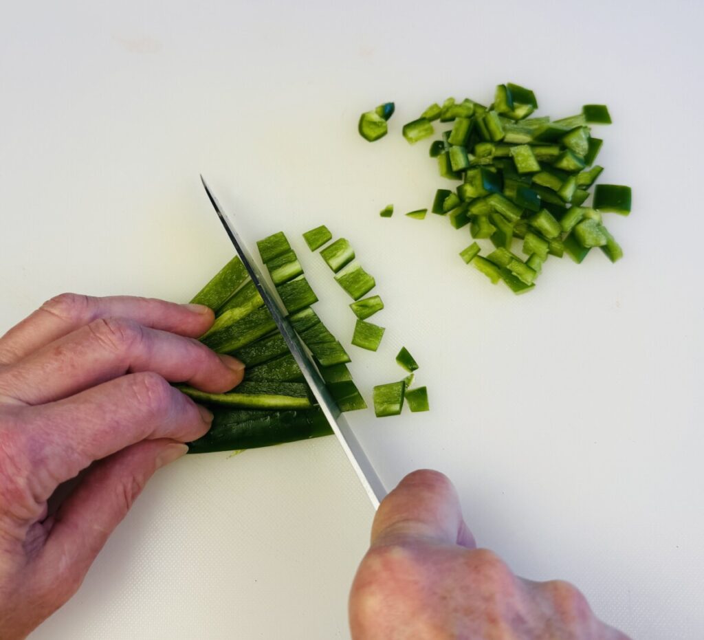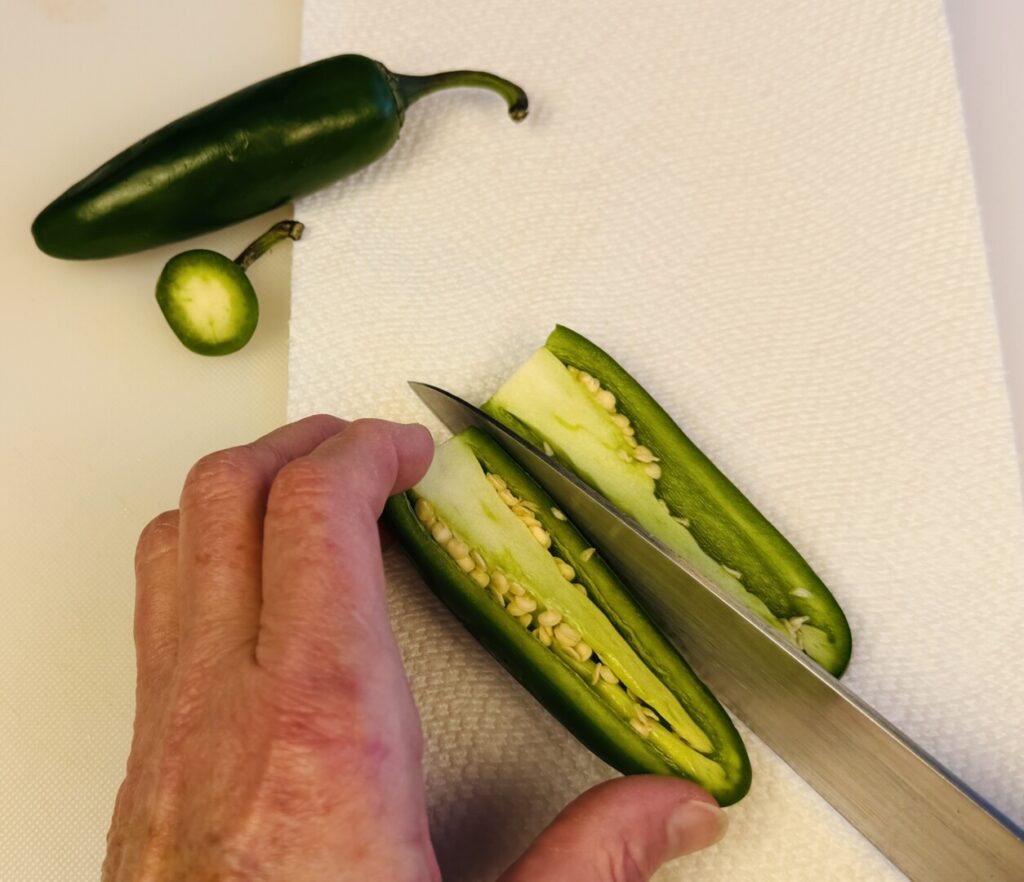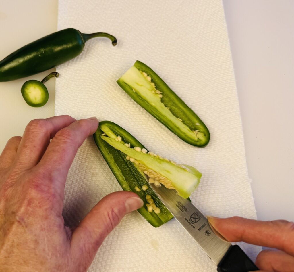 - Remove the stem ends of the jalapeños, cut the jalapeños in half lengthwise, and scrape out the seeds. Cut the jalapeños into small dice.