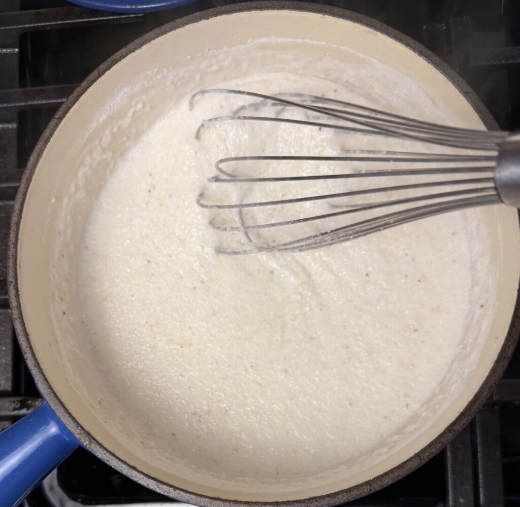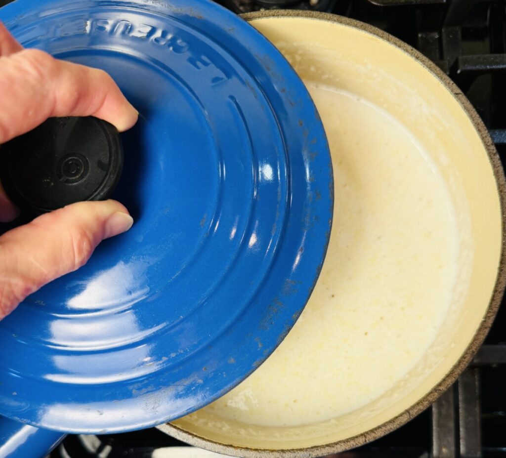 To finish cooking the grits, cover the pan and turn the heat to low. Cook for 10 minutes longer, occasionally stirring and scraping the bottom of the pan.