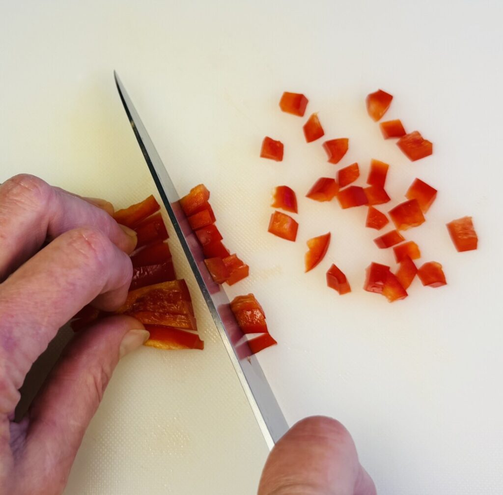 Fabricate the garnishes: dice the red bell pepper and chop the parsley.