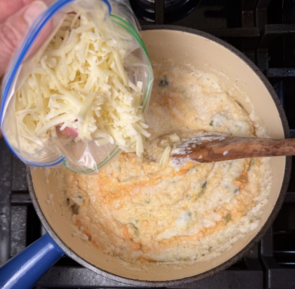 Just before serving, stir the grated cheddar into the hot grits, and remove the pan from heat.