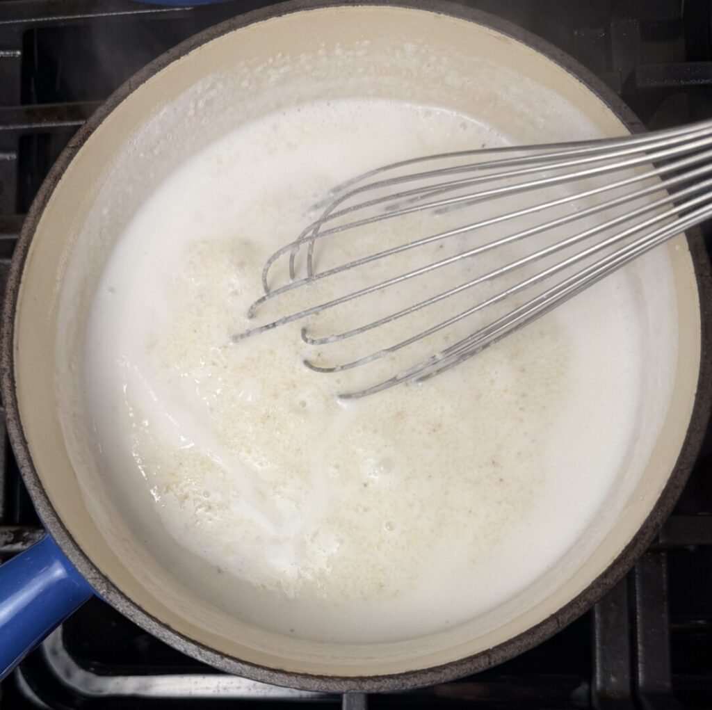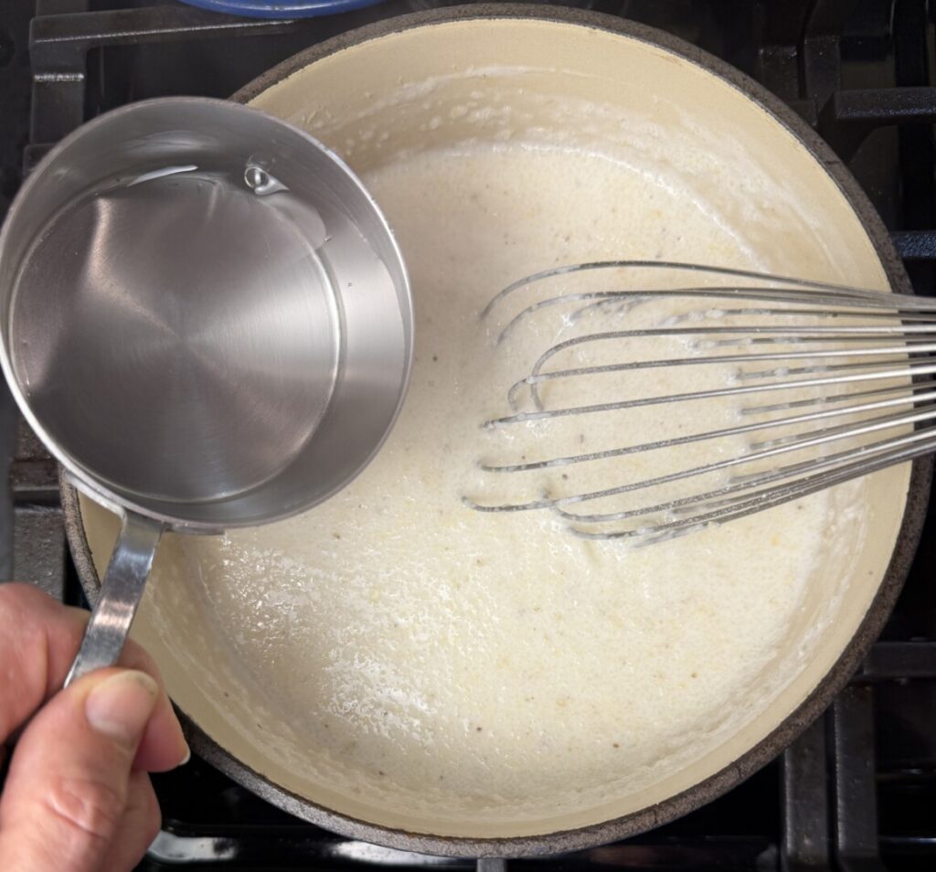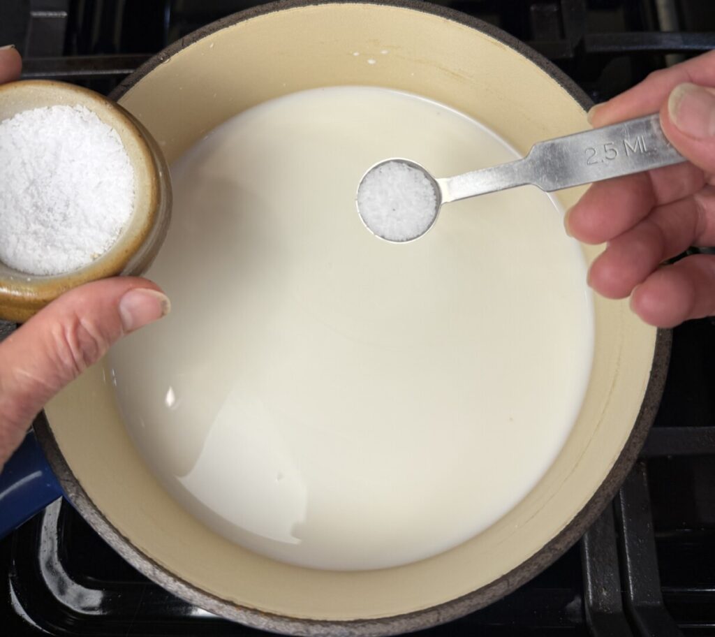 - Measure the half-and-half and 2 c water into a heavy saucepan and add the step 6 salt. Bring the mixture just to the boil.