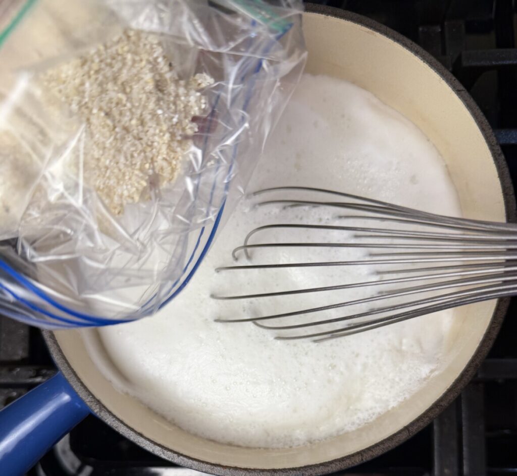 - Immediately whisk in the grits, pouring them in a thin stream to prevent lumping. Lower the heat to maintain a gentle simmer. Whisk continuously, making sure to scrape the bottom of the pan, until the grits thicken into a soft paste. Whisk in the remaining ½ c water. Continue whisking, getting into the corners of the pan to prevent scorching, for about 3 minutes longer.