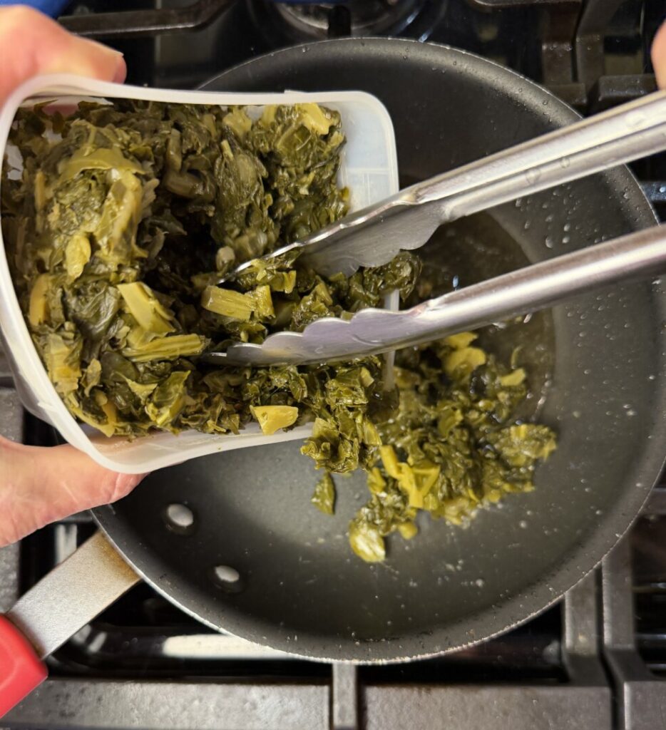 If you have the time, making a big pot of greens is a good investment as they freeze beautifully and thaw quickly in a microwave oven. Refer to this recipe if you’d like to make your own: https://prepholdcook.com/recipes/essentials/southern-style-collard-greens-with-bacon/