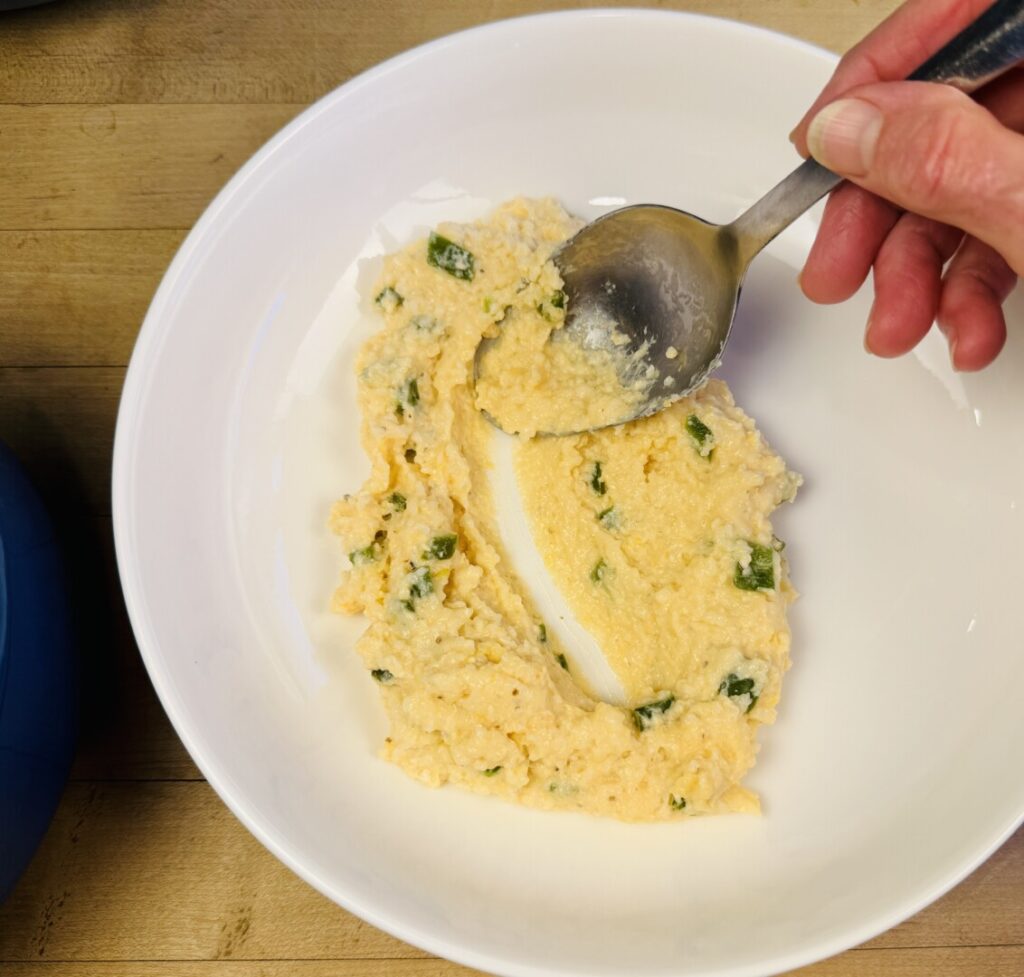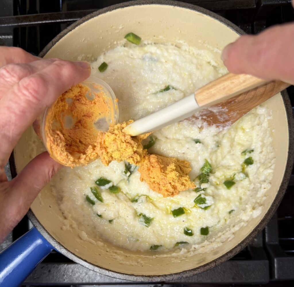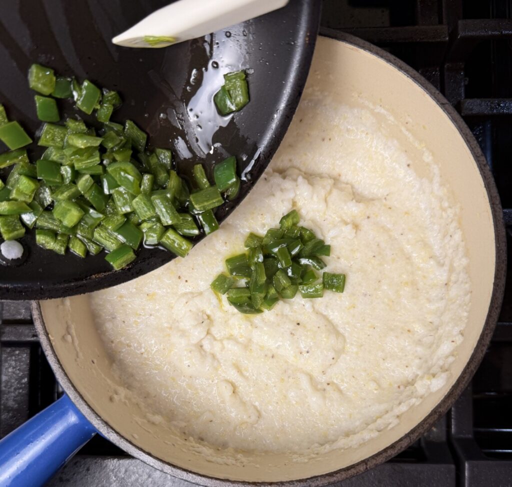 - Pour the jalapeños and butter into the grits, scraping the pan with a plastic spatula to include all of the butter. Stir in the spreadable cheese, and then evaluate the seasoning. Add more salt if needed.