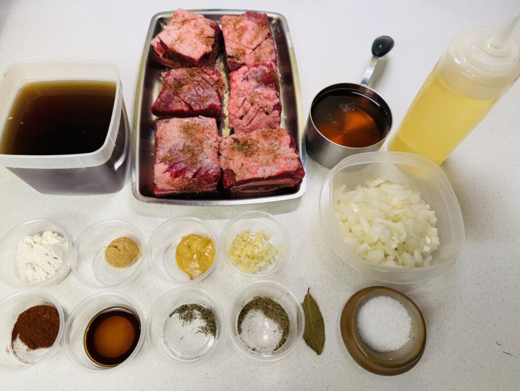 After you chop the onion and mince the garlic, assemble the mise for braising the short ribs.