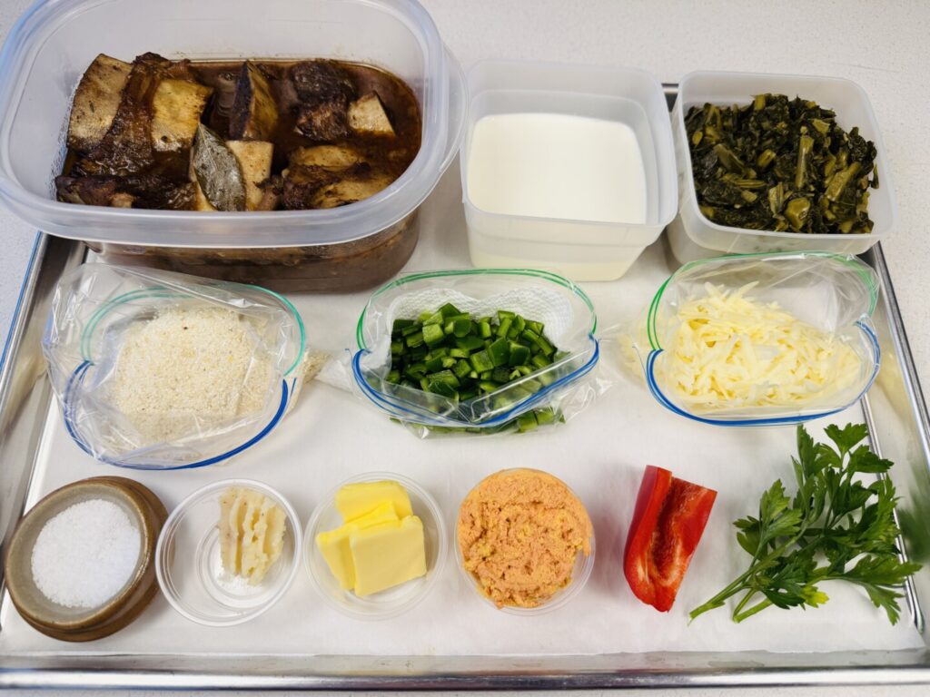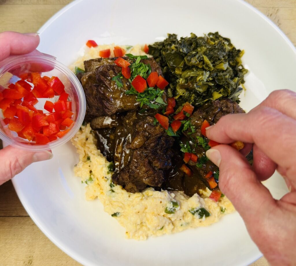 Spoon a mound of grits on the left side of each warmed, wide, shallow bowl. Use the back of the spoon to make a “swoosh” shaped well in the center of the grits. Place a portion of ribs in the well, meat-side-up. Place a mound of collard greens on the back left of the plate. Ladle a portion of sauce across the ribs and into the plate well. Sprinkle lines of parsley and red bell pepper dice across the ribs.