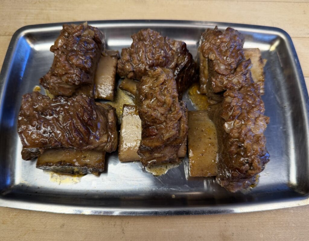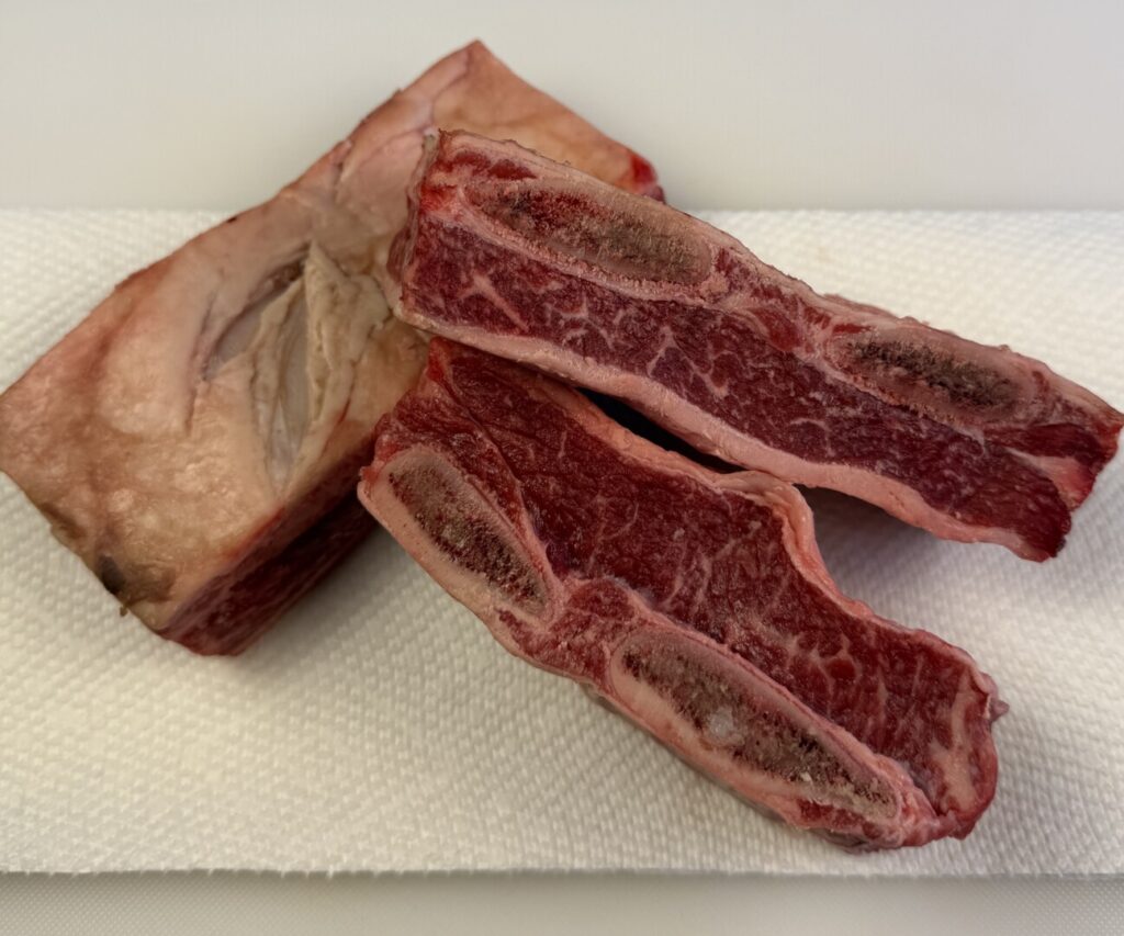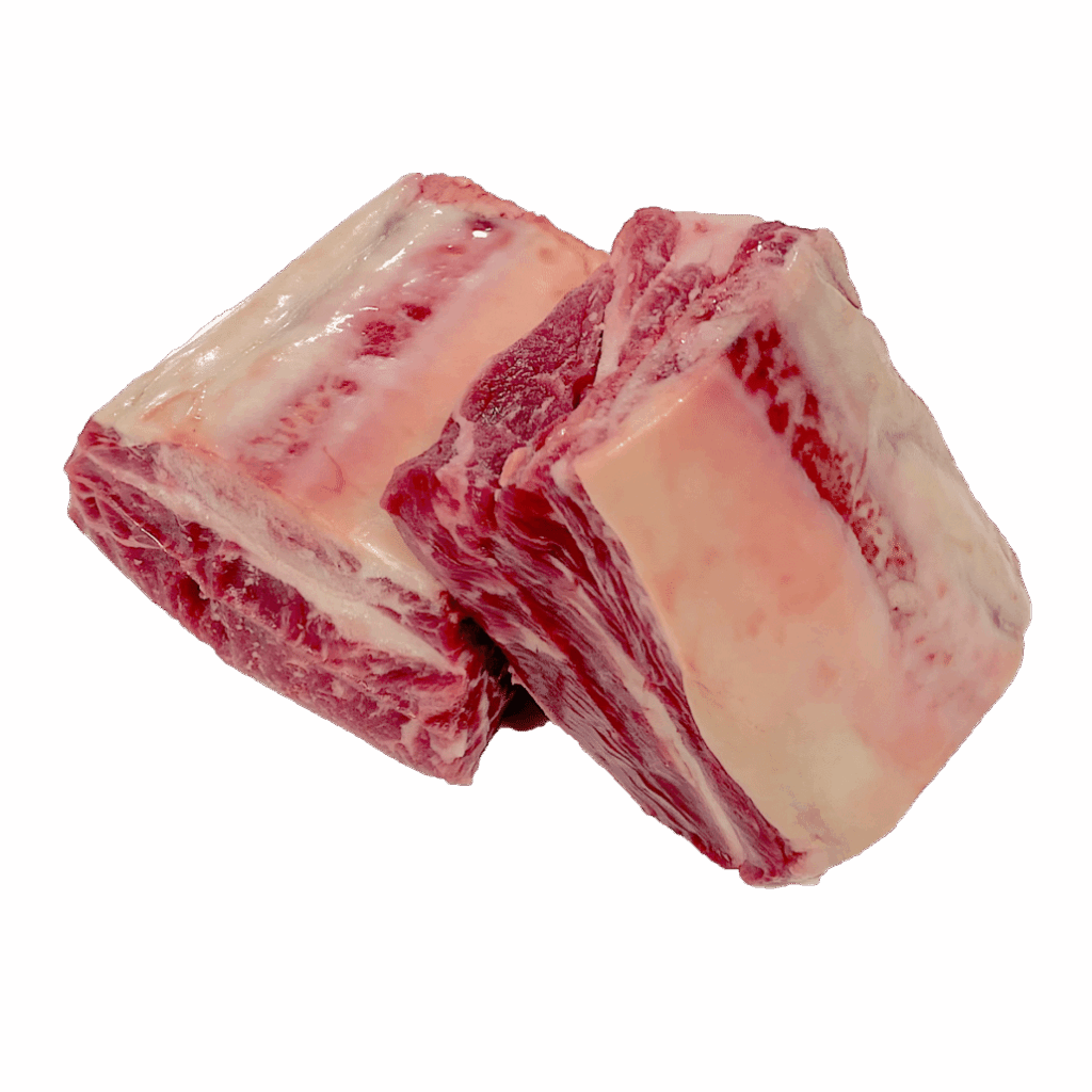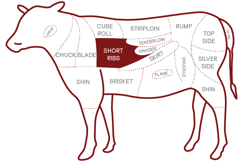 Beef short ribs are a tough, well-marbled cut derived from the central rib cage of a steer. “Marbling” refers to the presence of small veins of fat within the muscles of a meat carcass. When marbled meat is cooked this interior fat melts, creating a rich mouthfeel and luscious flavor. In this cut the meat is bound to the rib bones by tendons that are rich in gelatin-producing collagen. Because the meat of short ribs is tough, it requires long, slow cooking in the presence of moisture to break down fibers and, thus, tenderize it. Moist cooking also breaks down the structure of the tendons, releasing gelatinous fluids that give the resulting sauce body and full flavor.