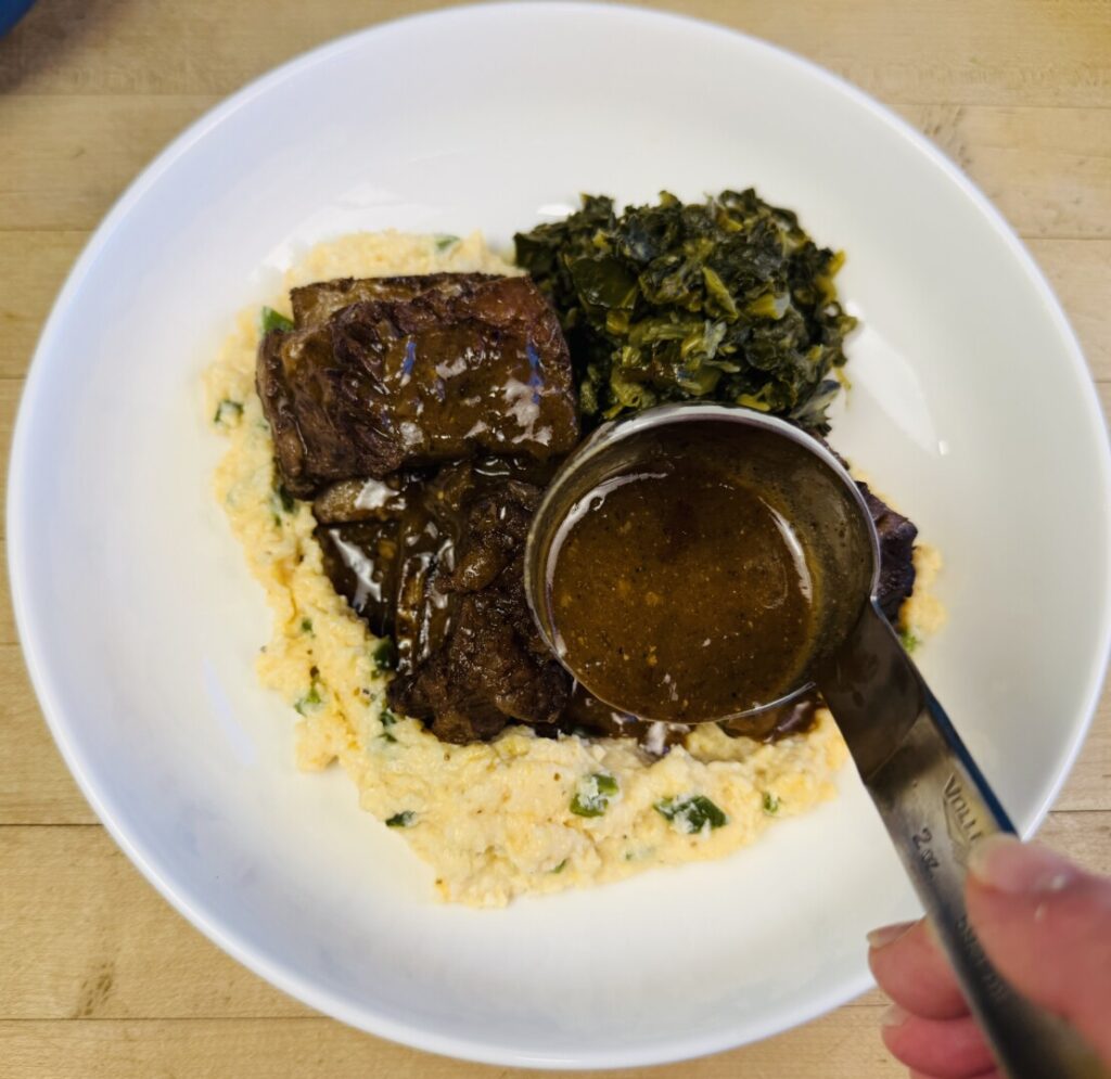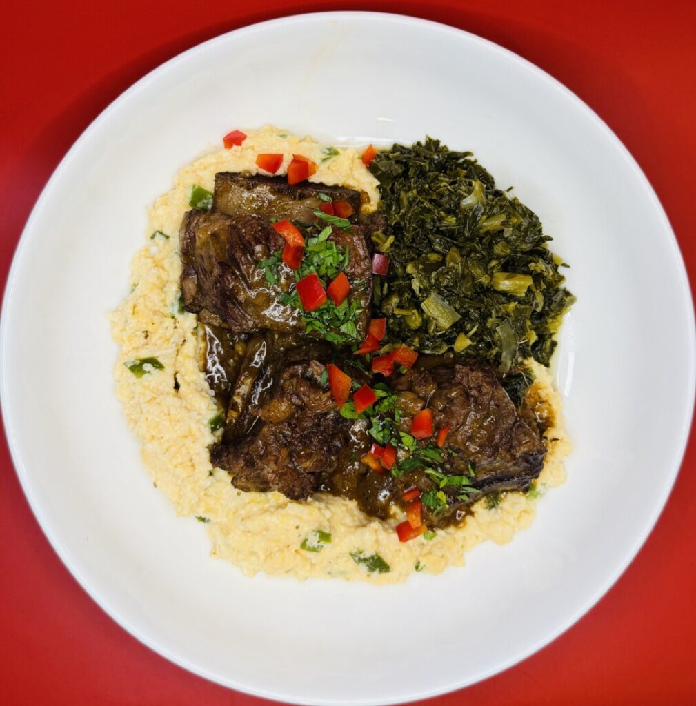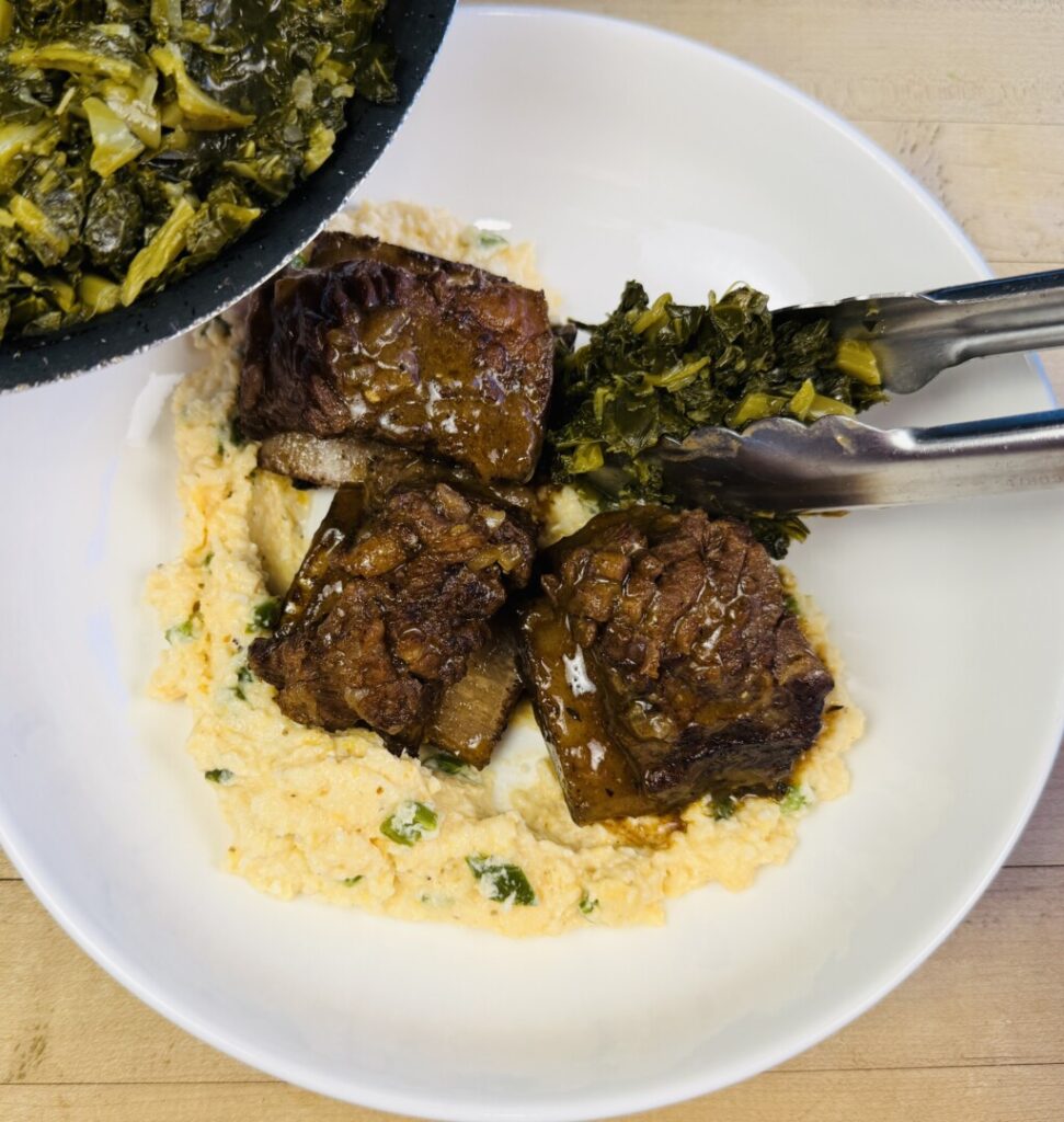 East Texas Beer-Braised Beef Short Ribs w/ Jalapeño Cheese Grits and Collard Greens