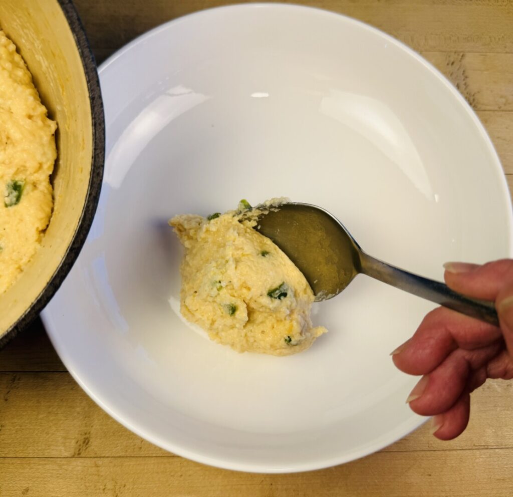 - Spoon a portion of grits into the left side of each warmed, wide, shallow bowl or plate. Use the back of the spoon, scraping from the near side of the plate to the far side, to create a “swoosh”-shaped well in the grits.