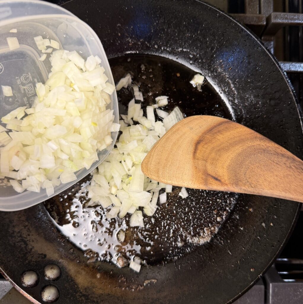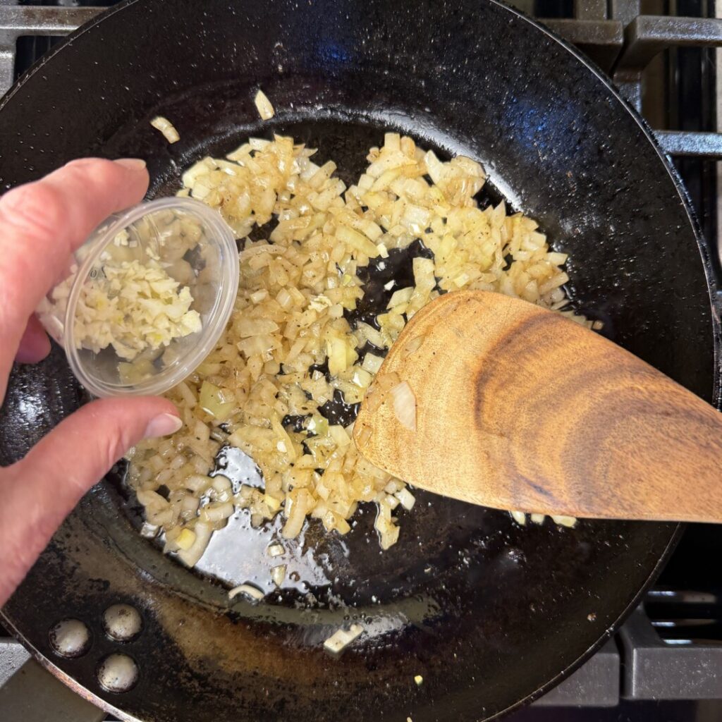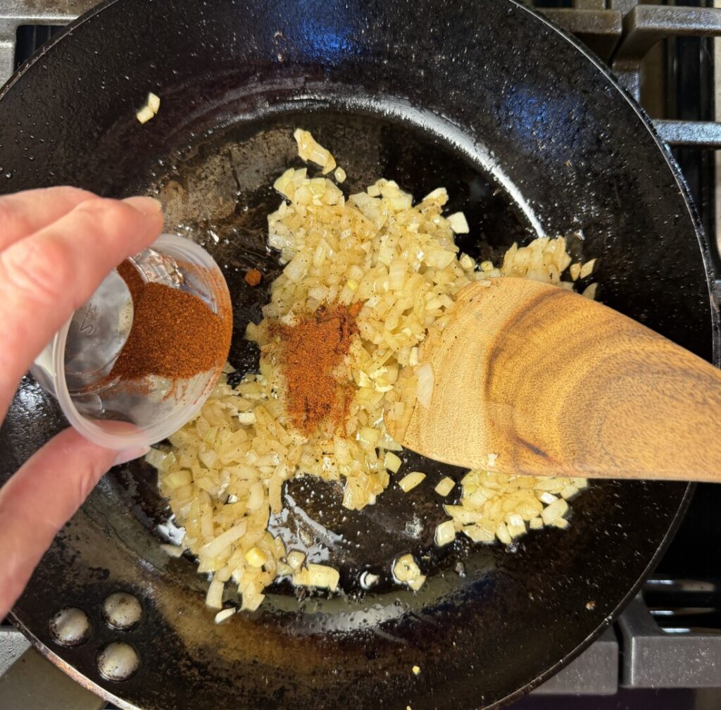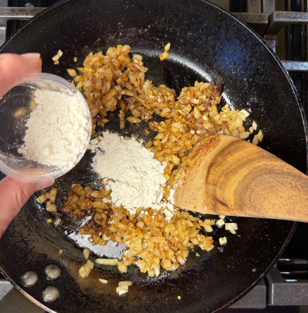 - Add the onions to the pan and sauté over medium heat for about 1 minute until golden brown. Add the garlic, and then stir in the step 3 chili powder and flour to make a roux. Cook, stirring constantly, for about a minute longer until the roux acquires a rich brown color.