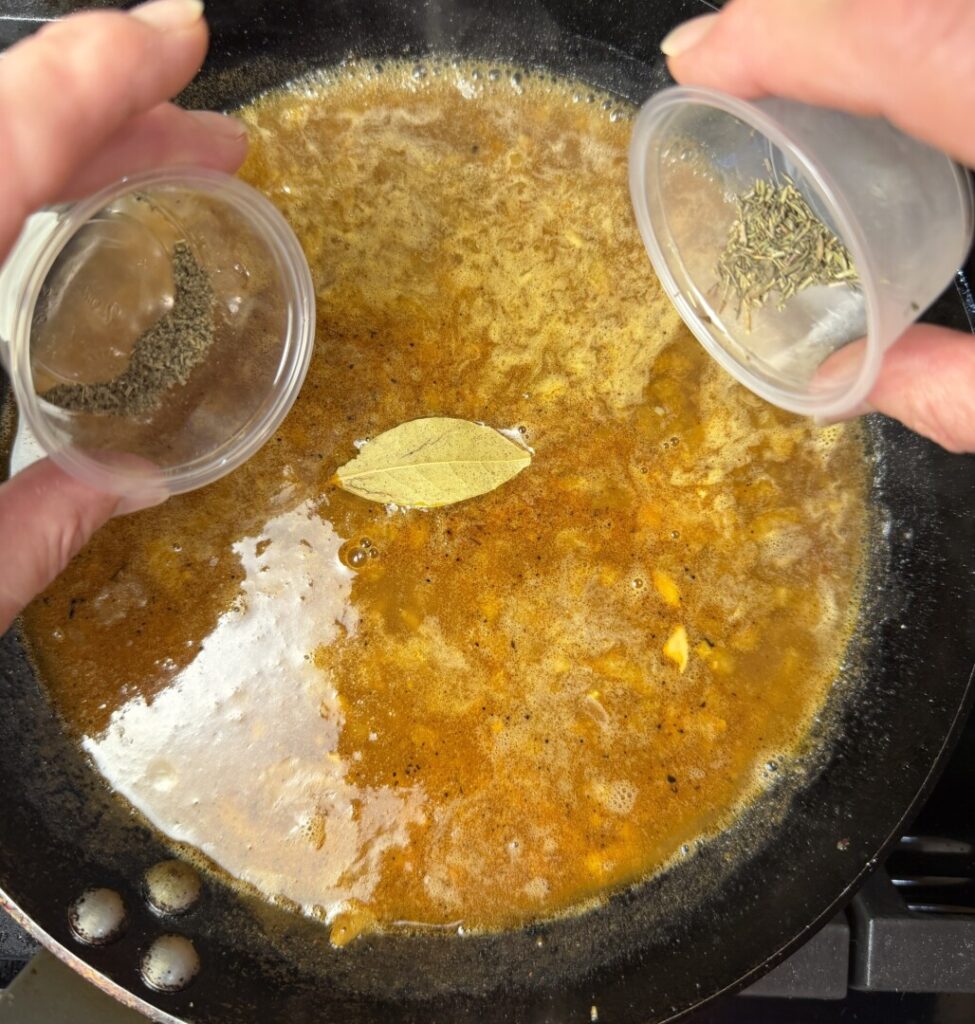 - When the sauce comes to the simmer, stir in the mustard, brown sugar, Worcestershire sauce, bay leaf, sage, and thyme. Season the sauce lightly with salt, keeping in mind that it will reduce and concentrate flavor during braising.