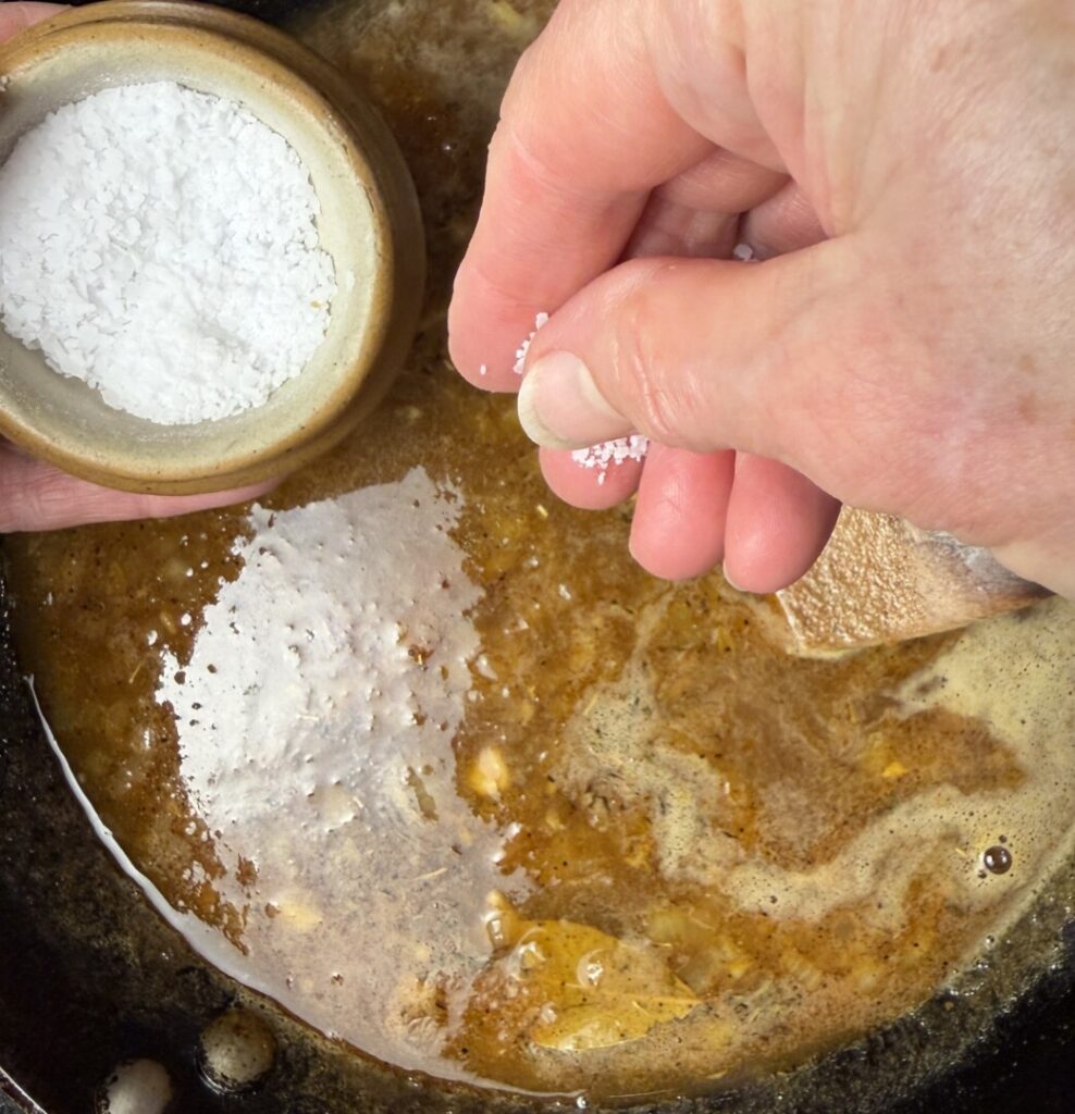 Then stir in the beer and stock in thin streams to avoid lumping. Add the mustard and herbs. Season very lightly with salt, keeping in mind that the sauce will reduce in the oven, thickening and concentrating its flavor. Bring the sauce to a lively simmer.