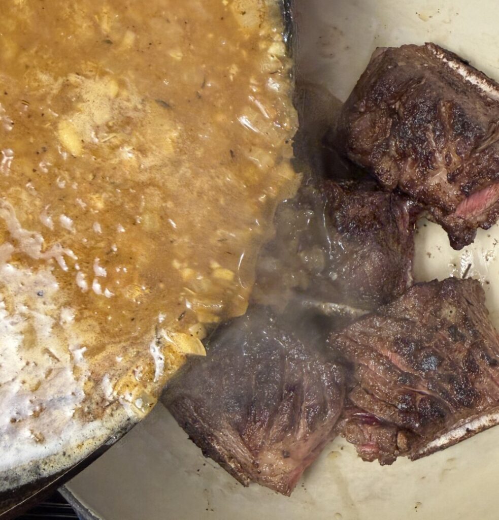 8. Re-heat the short ribs in their sauce, and correct its consistency: