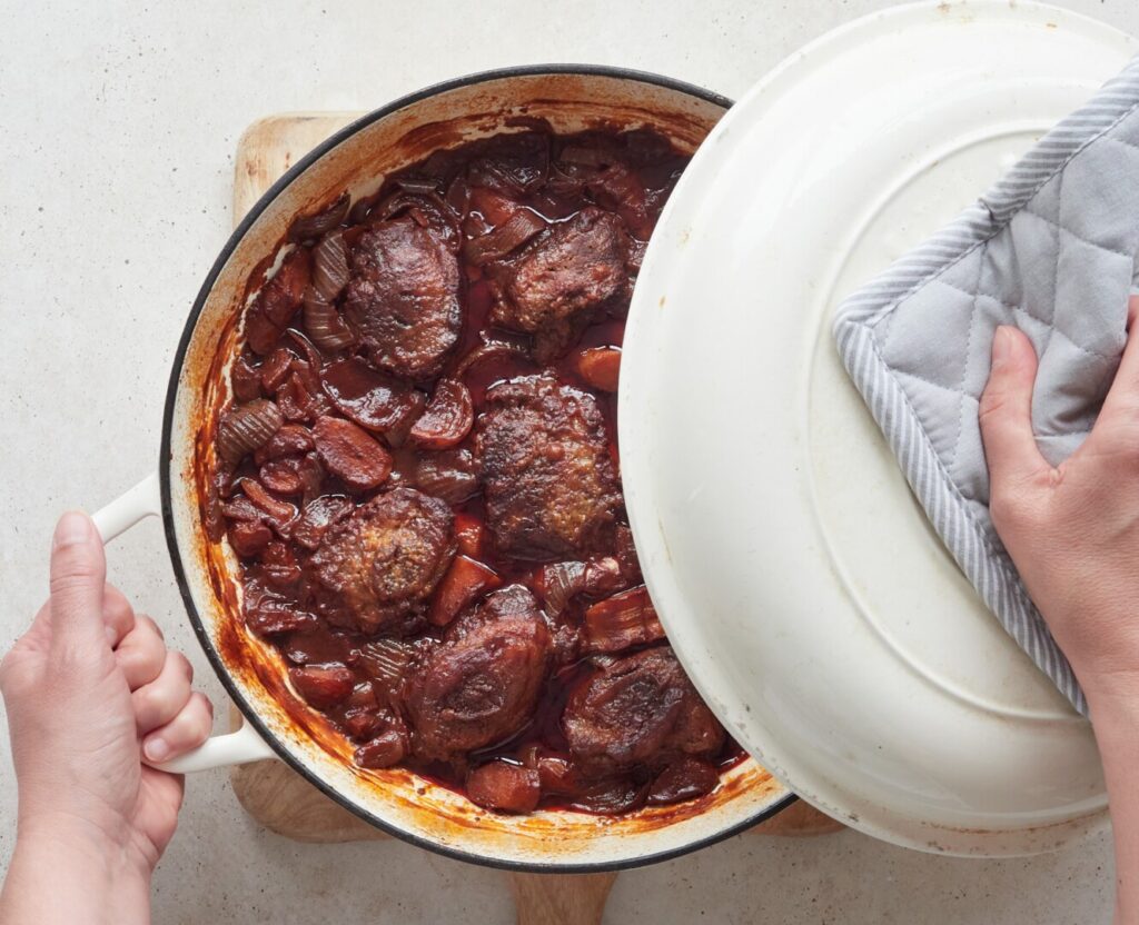 - Return the ribs to the casserole, turn off the heat, and cover the casserole.