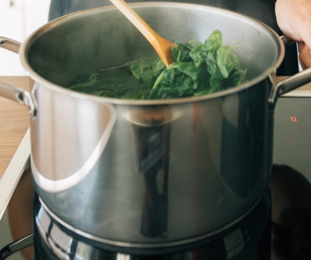 - Melt the bacon drippings or butter in a sauté pan and then stir in the greens and their liquid.