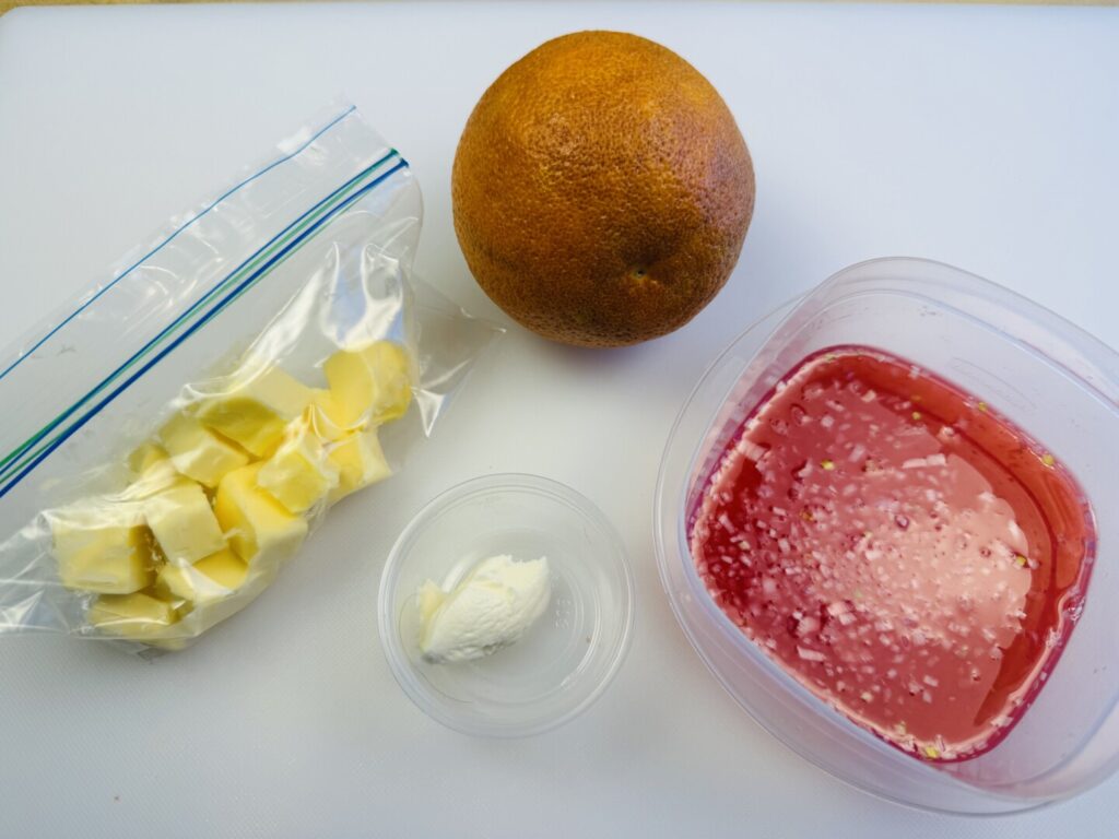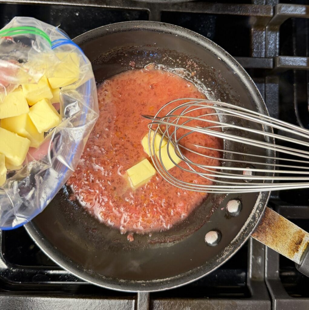 To prep the sauce, squeeze the blood orange juice into a container and then add minced shallots, a little salt, and some lemon juice to bring up the juice’s acidity level. Cube the butter and measure out the crème fraîche or cream.
