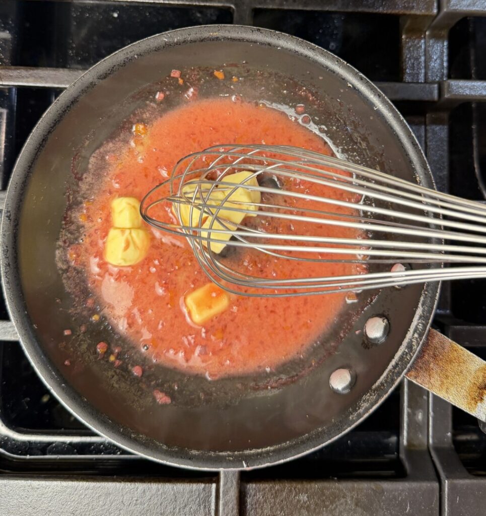 - Turn off the heat and whisk in the cold butter, one or two cubes at a time, so that they emulsify into a creamy, homogenous sauce. Turn on low heat only if necessary to continue softening the butter, then turn it off. Don’t allow the sauce to become hot or it will “break” and the butterfat separate out of the liquid component.
