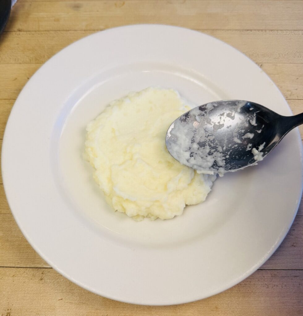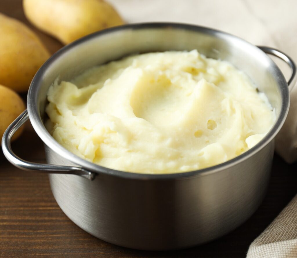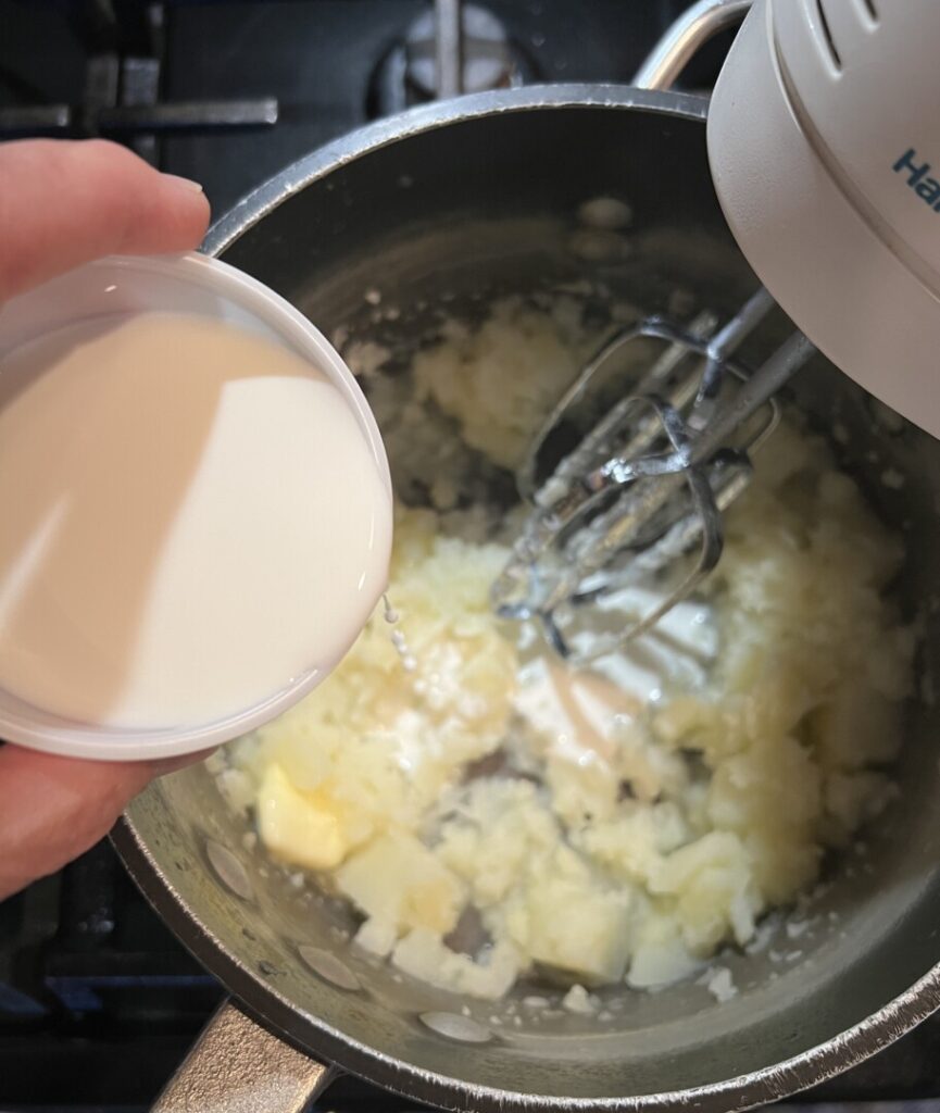 - Add the butter to the potatoes. Use a handheld electric mixer to whip the potatoes into a purée. Take care not to over-mix. When the potatoes are smooth, whip in the half-and-half. The consistency should be soft, light, and fluffy, and substantially looser than mashed potatoes. (The potatoes will thicken a bit as they hold.)