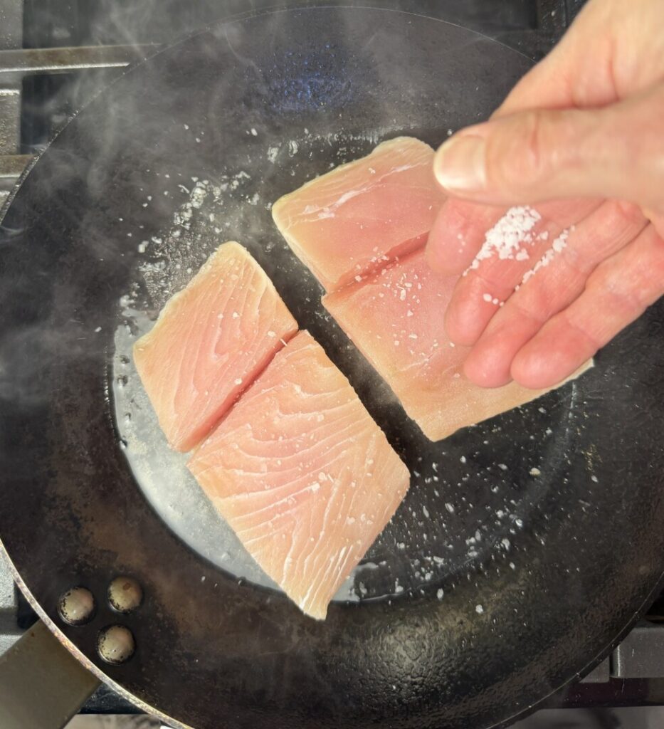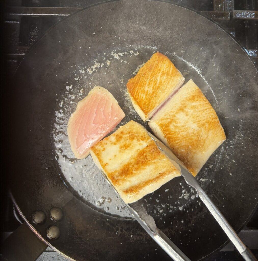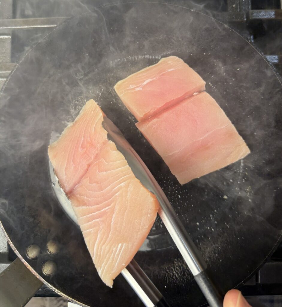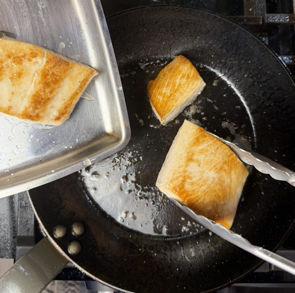 - Choose a heavy, preferably carbon steel sauté pan slightly larger than needed to accommodate the fish fillets. Place the pan over high heat until hot.