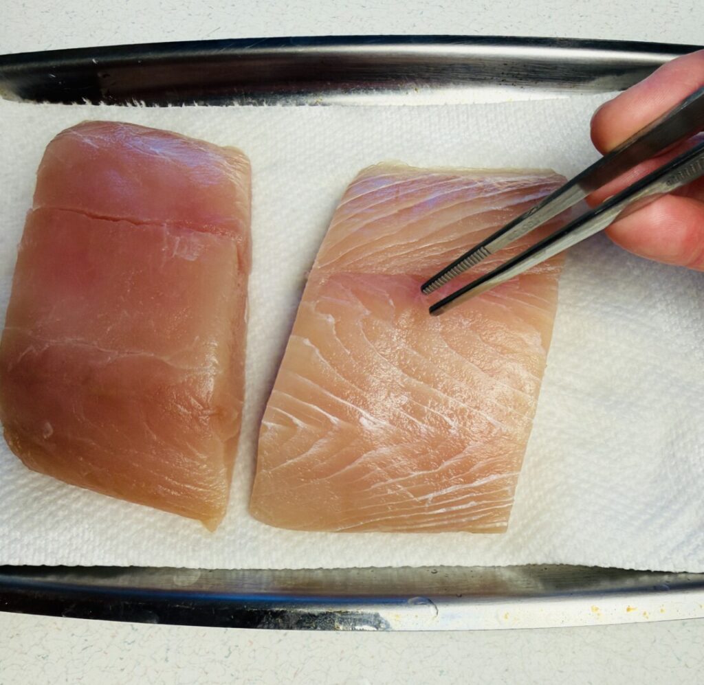 - Feel carefully for tiny pin bones and, if necessary, use kitchen tweezers to remove them.