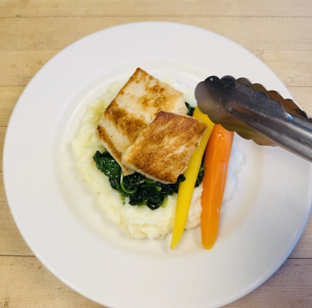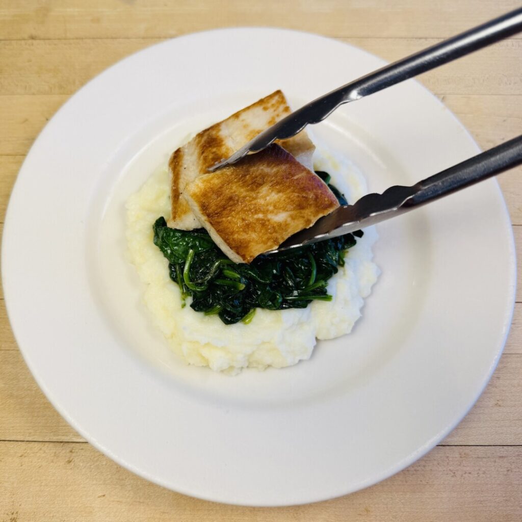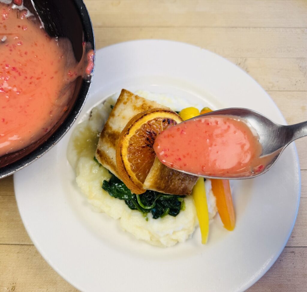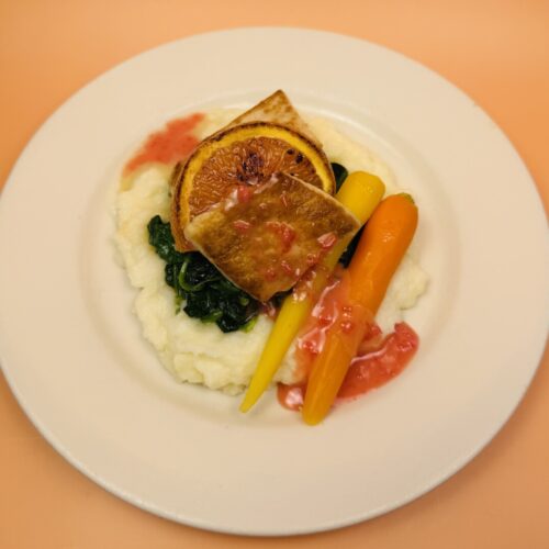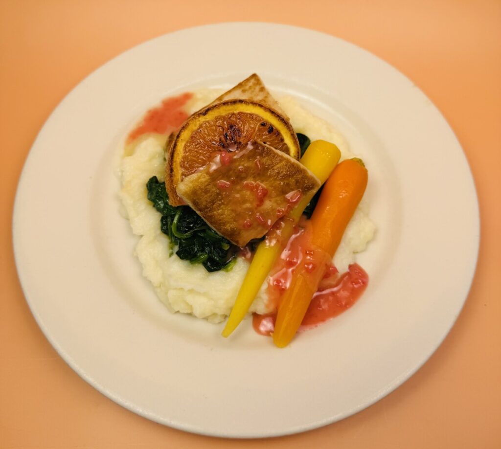 Pan-Seared Fish in Blood Orange Butter Sauce with Purée Potatoes, Baby Spinach, and Carrots