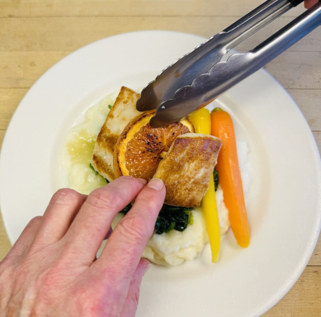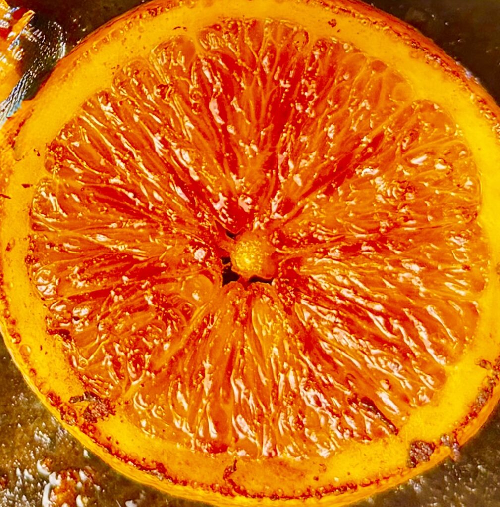 This dish doubles down on lively orange flavor by adding a pan-seared blood orange slice as a garnish. Searing in hot oil warms and softens the slice’s orange flesh and lightly caramelizes the rind. As with most modern plate garnishes, the orange slices are meant to be eaten. The tart, slightly bittersweet flavor of the slice contrasts nicely with the rich mouthfeel and sweet flavor of the sauce.