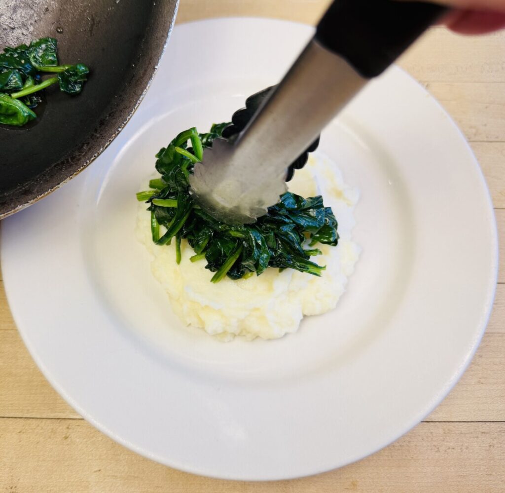 - Mound a portion of spinach in the center of the potatoes on each plate.