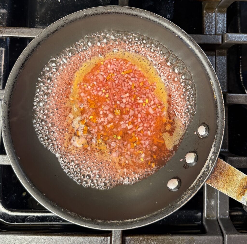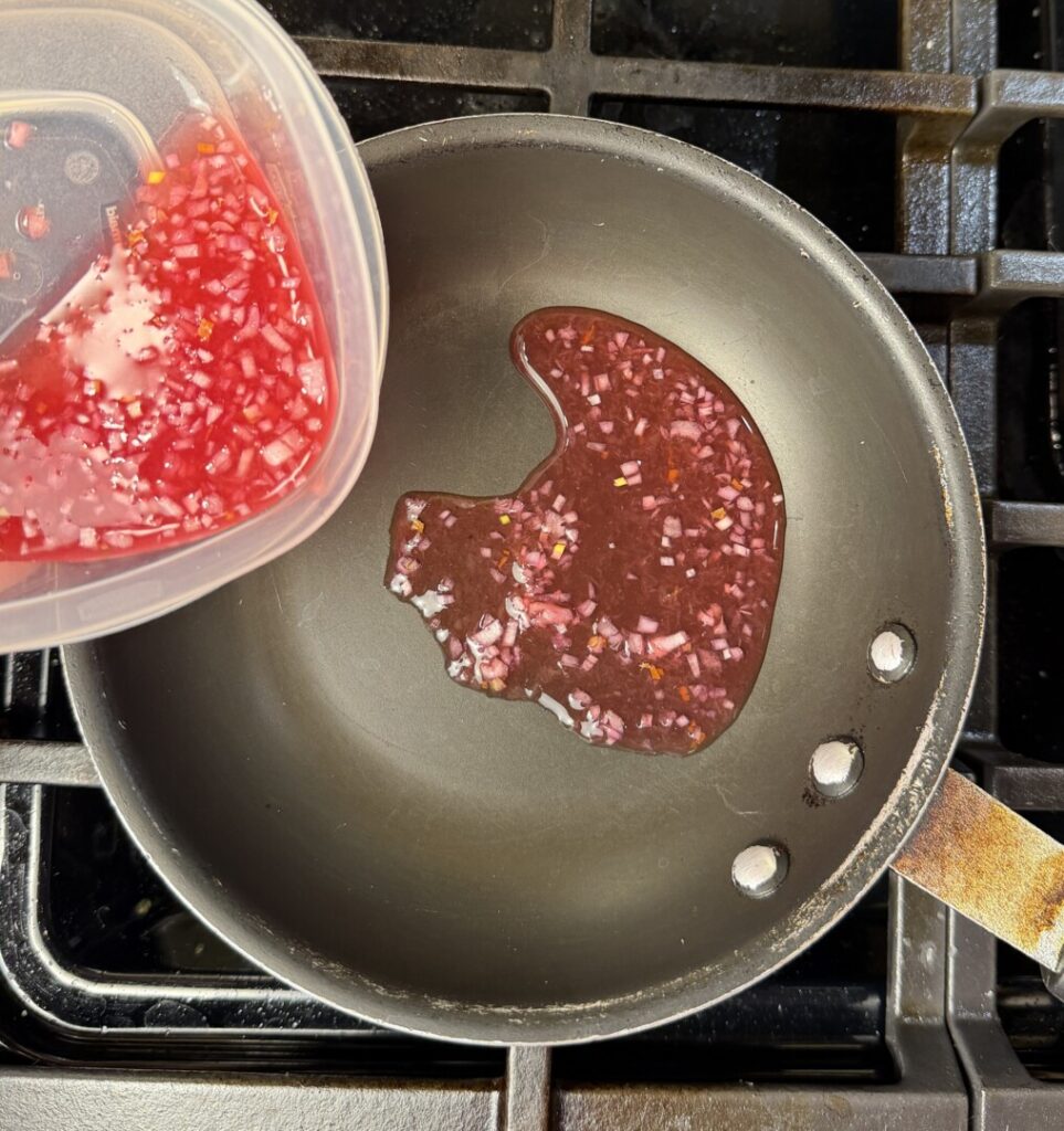 - Pour the sauce mixture into a small sauté pan, ensuring that all of the zest and shallots go into the pan. Place the pan over low heat and simmer about 1 minute until the sauce reduces to about 2 Tbsp per serving. Watch carefully to avoid scorching.