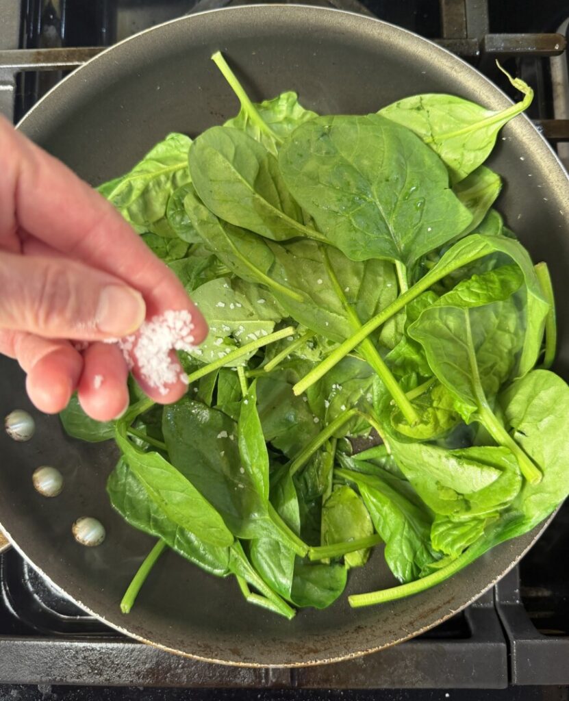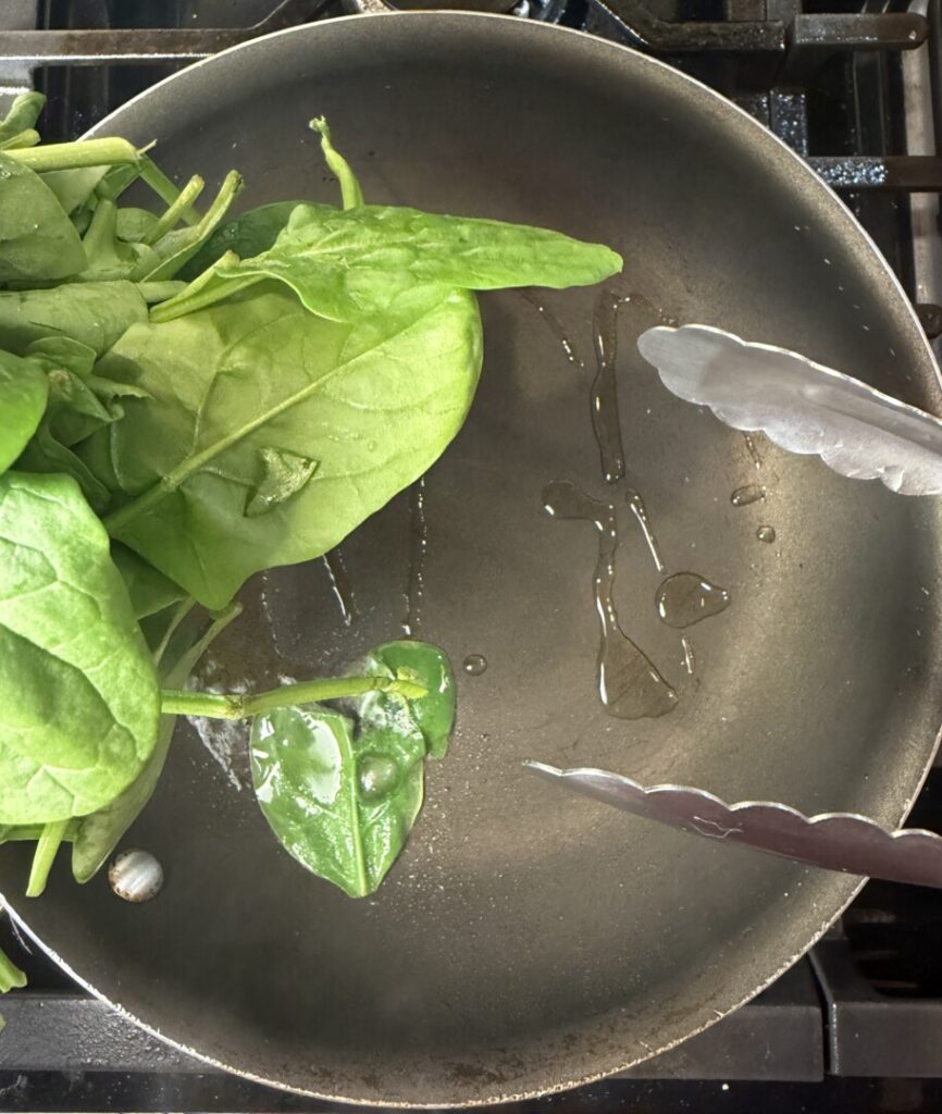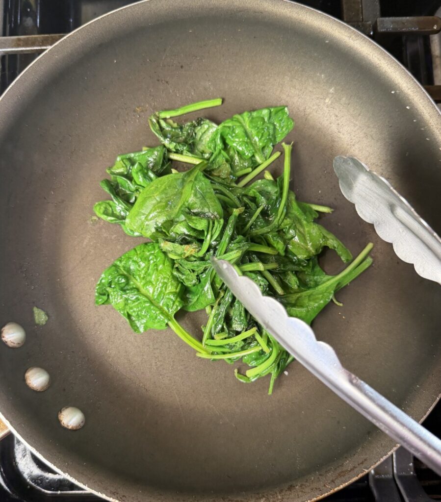 - When the second batch of spinach is wilted, return the first batch to the pan, leaving any liquid behind.