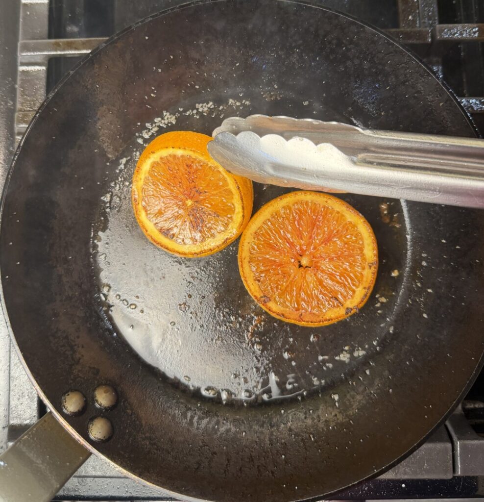 - Squeeze a bit more oil into the pan and then place the orange slices in it. Sauté them for about 30 seconds on each side until then flesh is browned in some places and the rinds are slightly charred. Transfer to the sizzle pan, and then cut each orange slice in half.