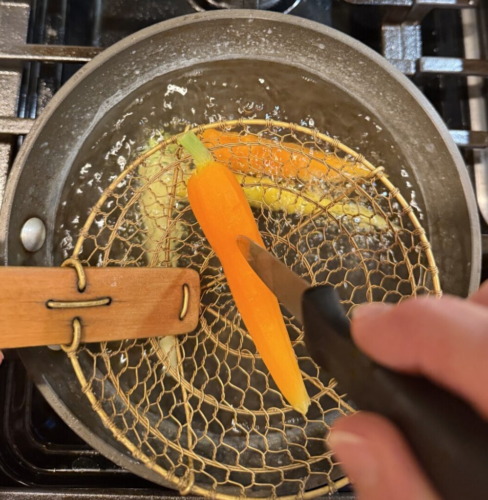 Start by fabricating and par-cooking the carrots. Multicolor young carrots make a visually stunning accompaniment to almost any dish. They’re usually sweeter and more tender than fully mature carrots, as well. Although these carrots usually are sold pre-peeled, during the shipping and holding process the exteriors of the peeled carrots often lose color and flavor due to oxidation. I usually shave off the outer layer with a swivel peeler to reveal the more brightly-colored flesh beneath. Use the tip of a paring knife to carve off any discolorations where the wide “shoulder” of each carrot meets the stem.