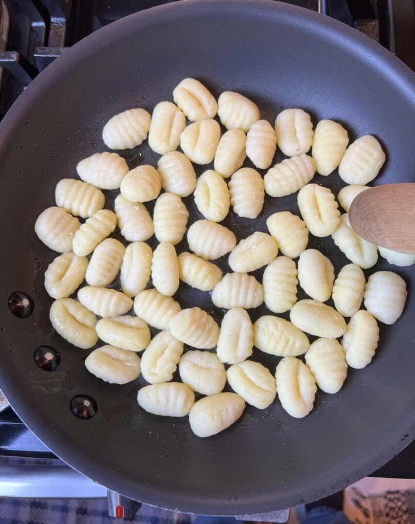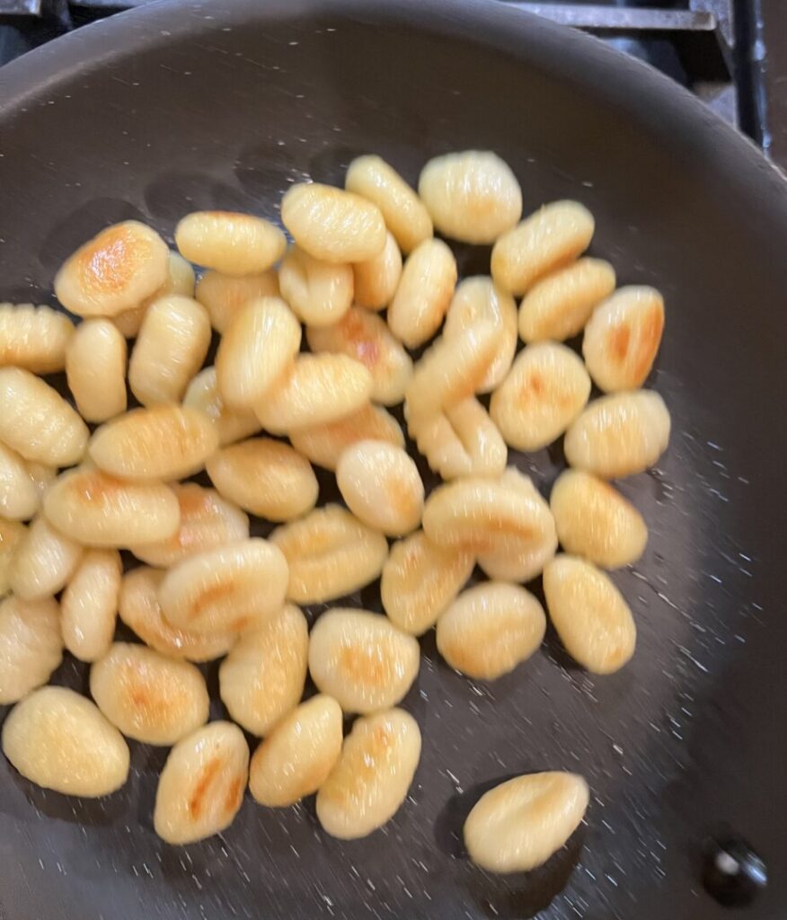 - Choose a non-stick sauté pan large enough to accommodate all of the recipe ingredients. Place it over medium heat and wait for it to become hot but not smoking. Add the step 7 oil, and then add the gnocchi. Sauté, stirring and flipping them often, for about 10 minutes until the gnocchi are golden brown on all sides.