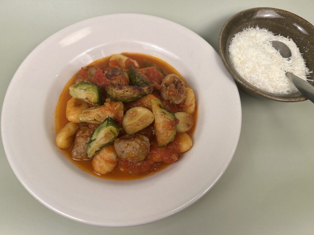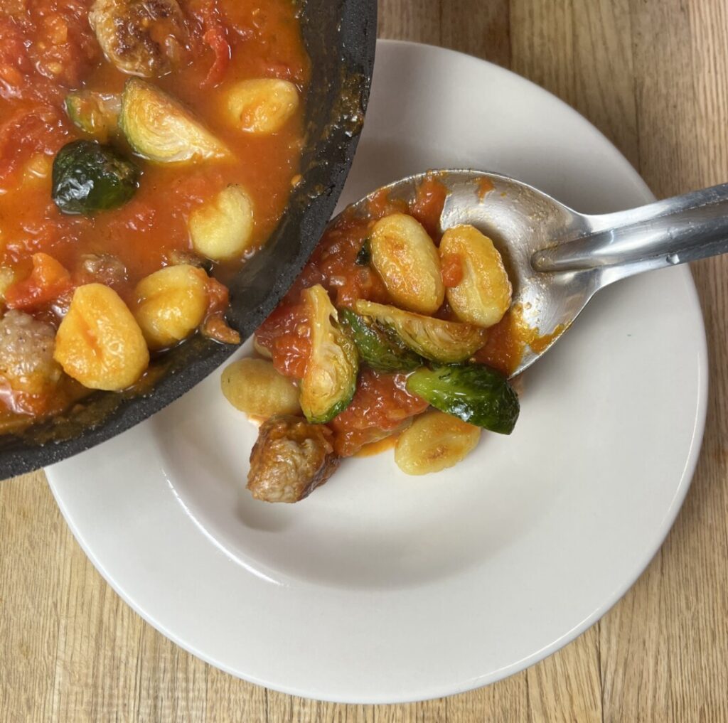Sautéed Gnocchi with Sausage and Brussels Sprouts in Winter Tomato Sauce