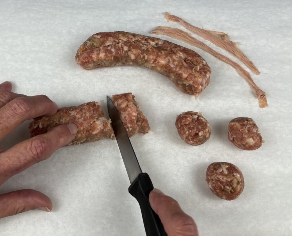 - Cut or pull apart the sausage into 1 Tbsp-size pieces weighing about ½ oz.