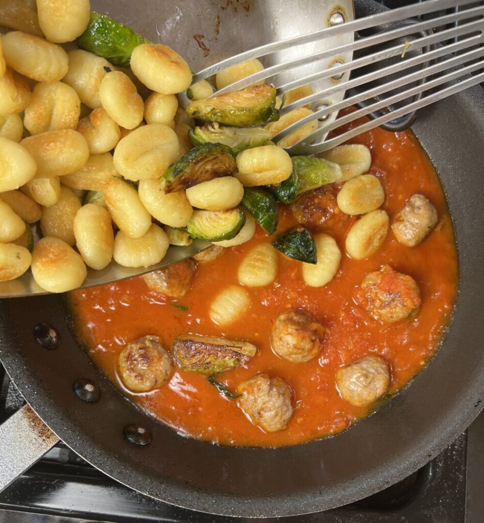 - Spoon the gnocchi, Brussels sprouts, garlic cloves, and meatballs into warm pasta plates or wide bowls, and spoon any remaining sauce overtop.