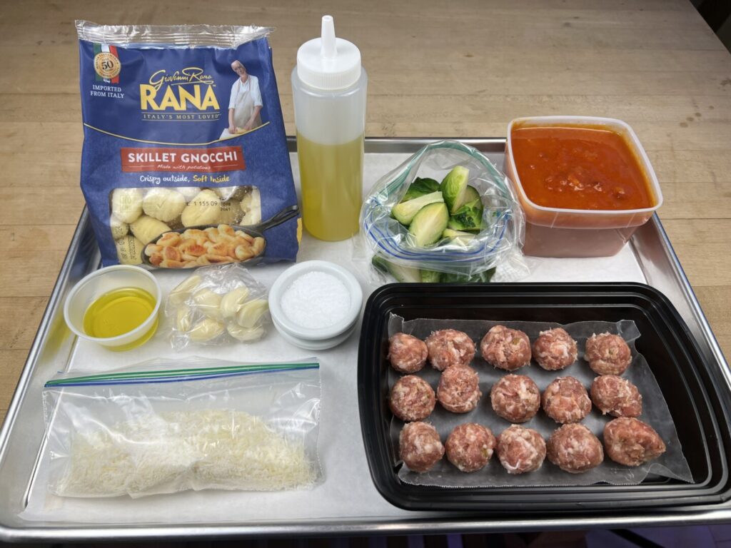 Sautéing the gnocchi takes only a few minutes. For direct high-heat cooking we’re using a pure, gold-colored oil with a higher smoke point than extra-virgin oil. Using a nonstick pan allows you to go easy on the oil, but keep in mind that starches need fat in order to properly brown. If you don’t hear sizzling and the gnocchi are looking scorchy, add more oil. When done, slide them into the baking dish overtop the Brussels sprouts. You’ll cook the sausage meatballs in the same pan.