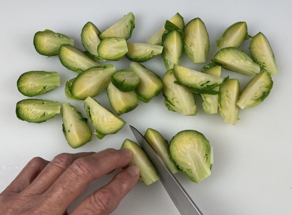 - If the sprouts are large, quarter them lengthwise. Cut medium-size sprouts in half.