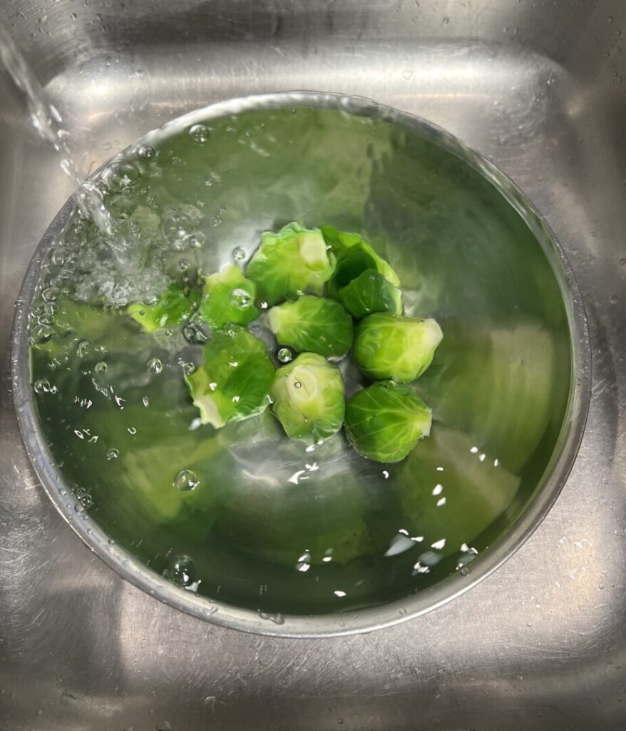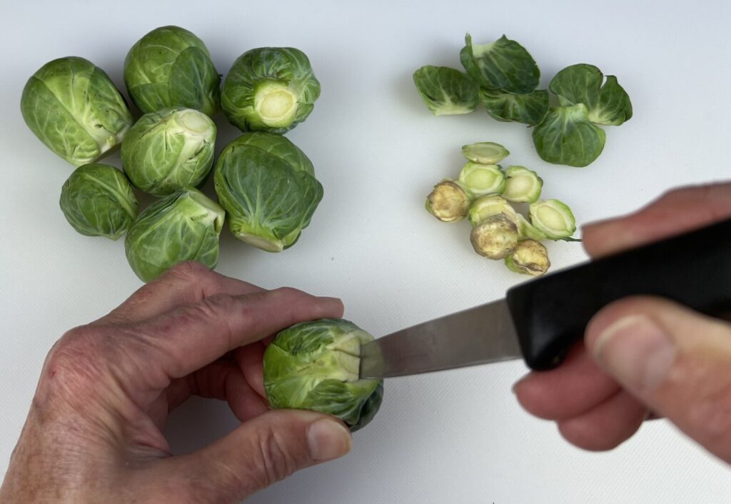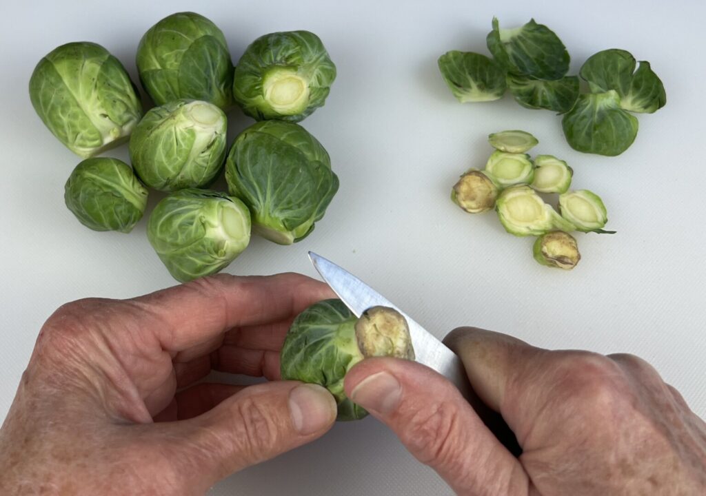 - Trim off the hard stem end of each sprout. Cut an “X” into the stem end of each sprout, cutting in about ⅛ inch.