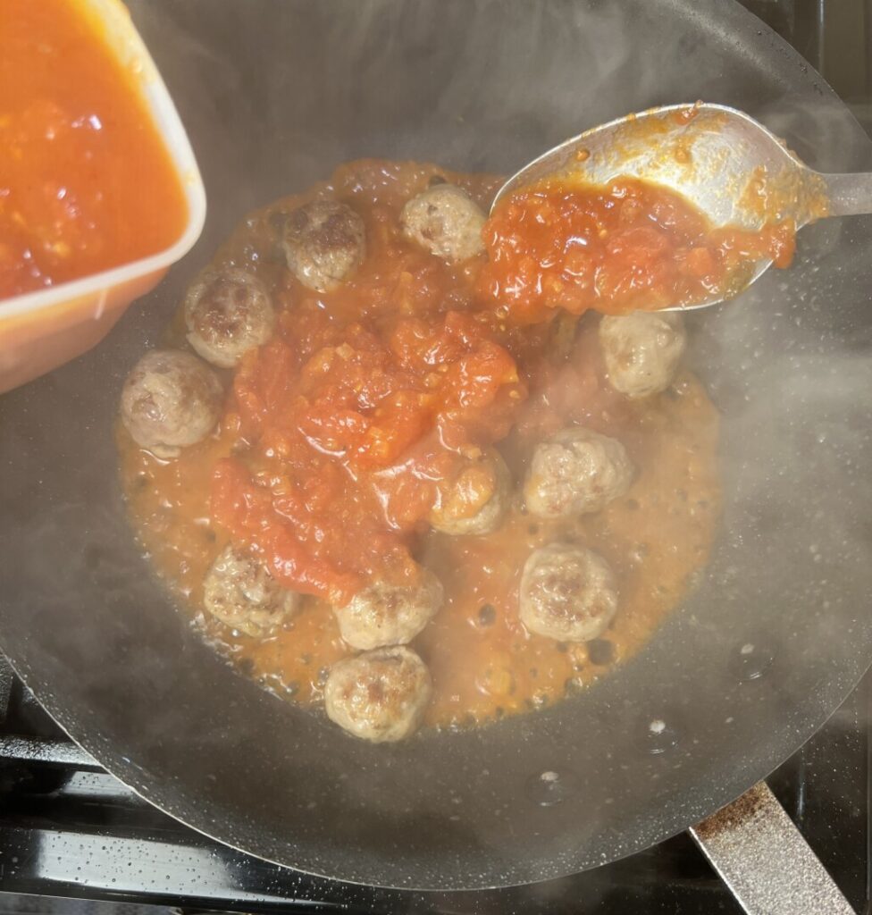 - Add the tomato sauce to the pan, cover, and simmer about 2 minutes longer until the meatballs are cooked through.