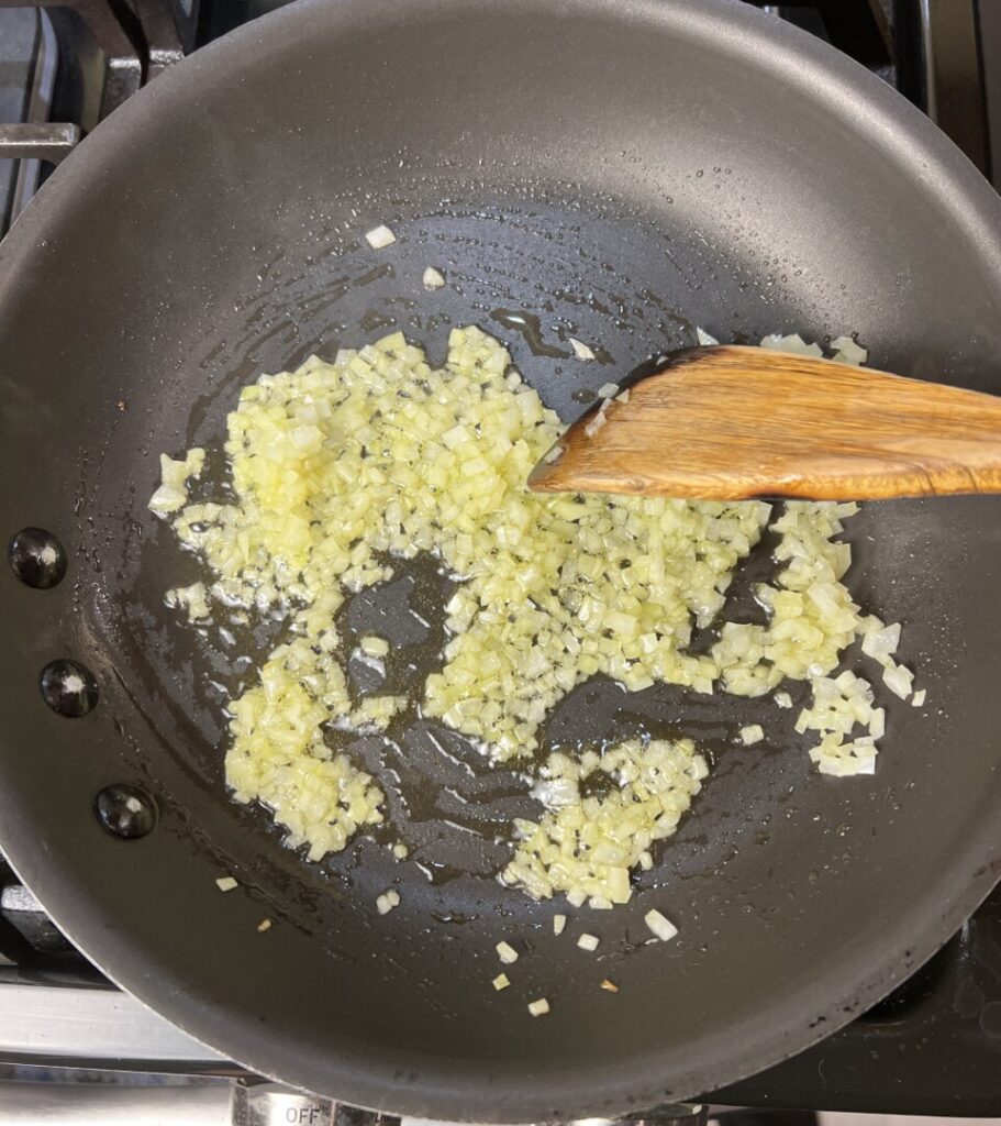 - Combine the step 2 oil and minced onion in a sauté pan. Place over low heat and cook, stirring occasionally, about 1 minute until the onion softens and becomes fragrant. Do not allow to brown.