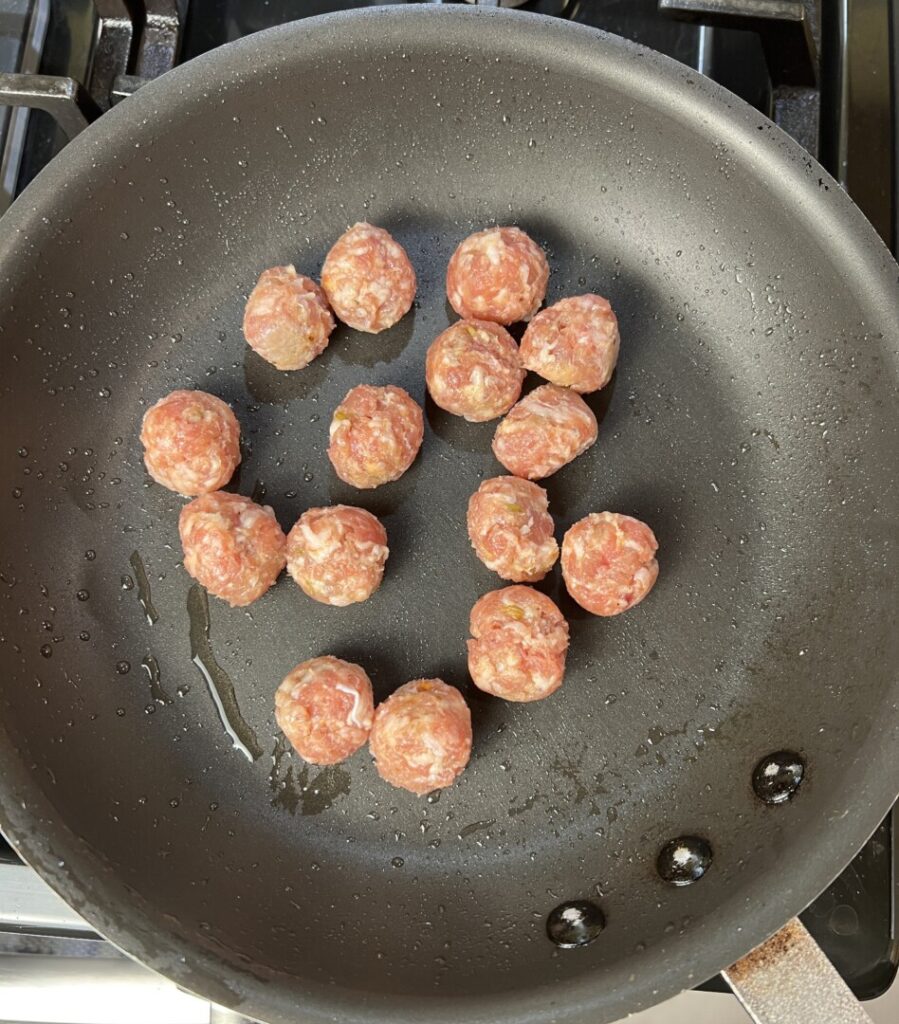- Add the meatballs to the pan. Sauté, rolling the meatballs around in the pan, for about 1 minute until the meatballs brown on all sides.